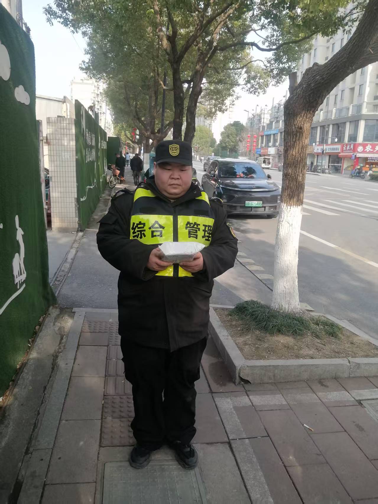 2月26日15:40,浙江民泰公司駐杭州市余杭區(qū)五常街道市容項(xiàng)目員工周成成在五常街道同順街巡查時,撿到一個未拆封的快遞,報告帶班組長后,便按指示在原地等待失主。