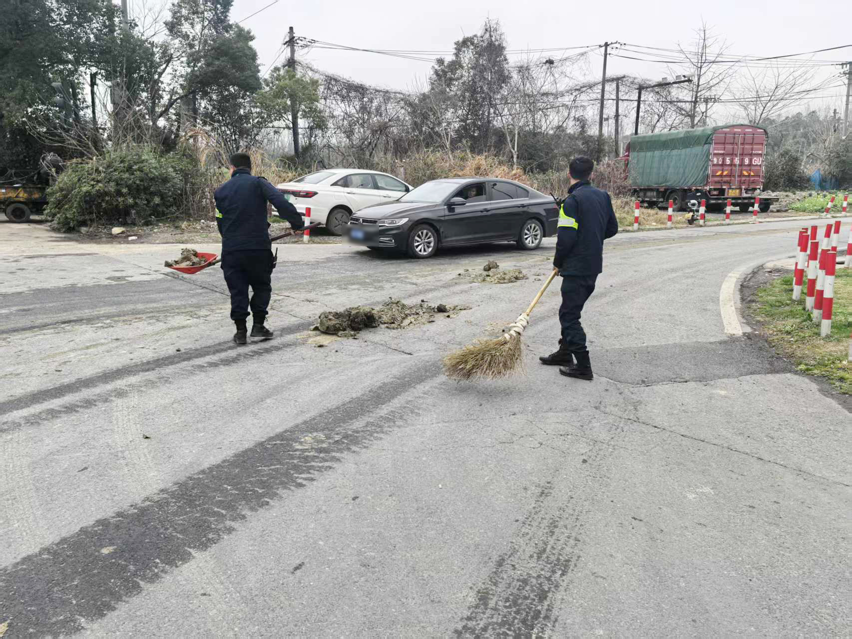 3月5日,浙江民泰公司駐杭州市余杭區(qū)良渚新城派出所輔助項目員工齊心協(xié)力清理路面散落黏土,保障道路通行安全。