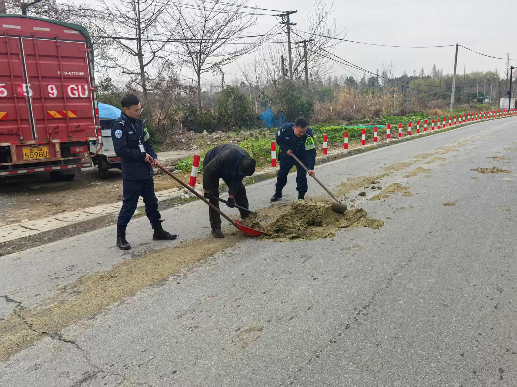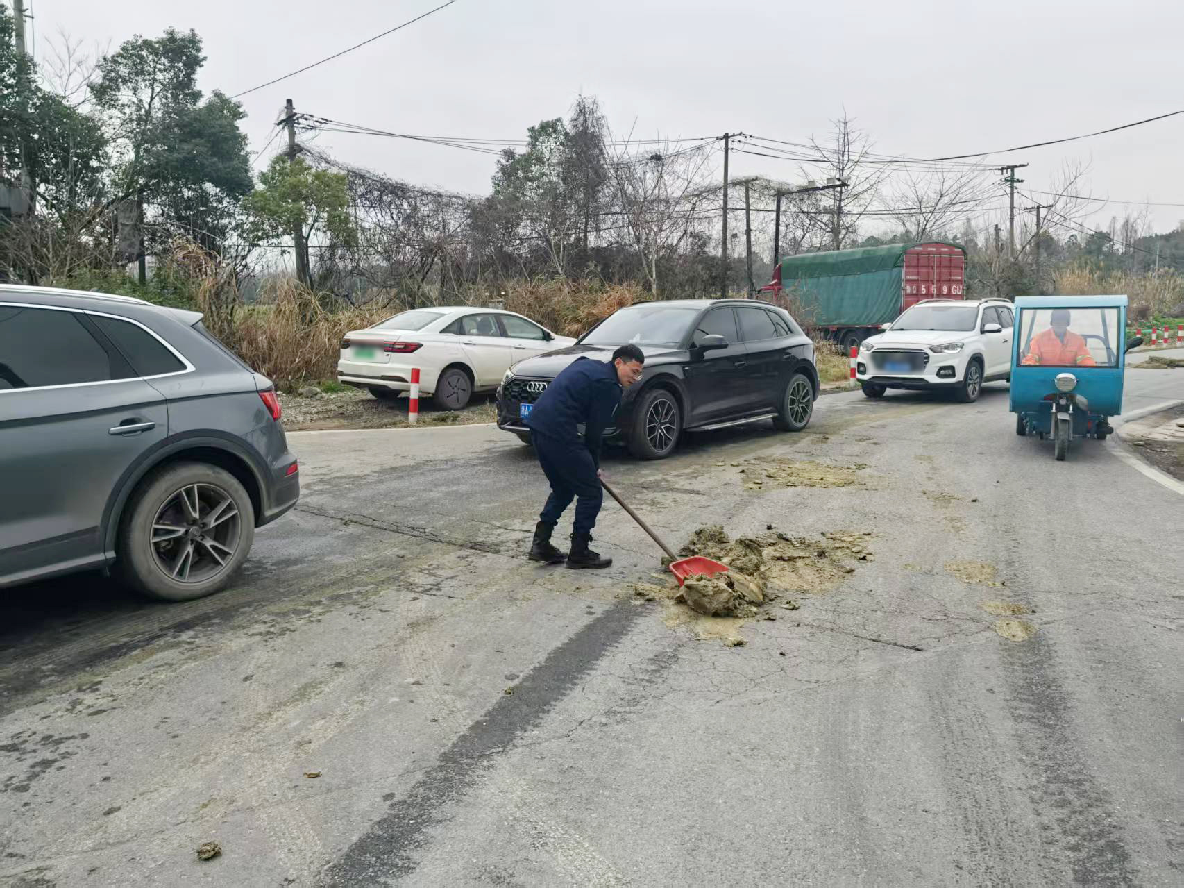 面對這一緊急情況,巡車長張正富迅速做出反應(yīng),站在路口指揮交通,確保車輛能夠有序通行,有效防止事故的發(fā)生。與此同時,公司員工賈雙諭和隊員周軍也在第一時間行動起來,他們在周圍設(shè)置了警示區(qū)域并放置警示標(biāo)識以提醒路人注意安全,隨后從附近停車場借來了鐵鍬、鐵耙等必要的清理工具,投入到緊張的清理工作中去。