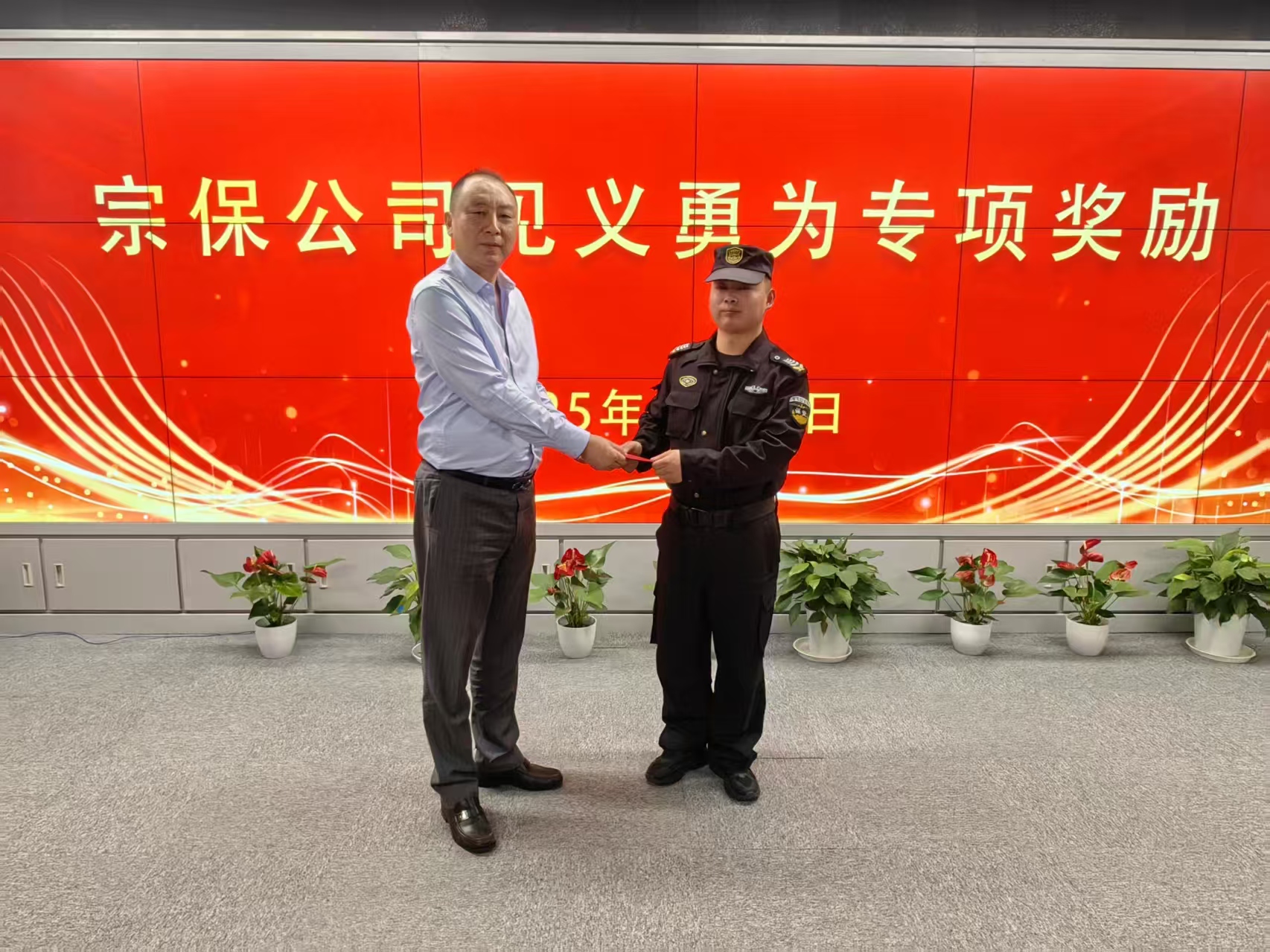 3月26日,上海宗保保安服務(wù)有限公司在浦東新區(qū)周浦基地舉行儀式,向在值勤期間成功化解突發(fā)事件的員工何征明頒發(fā)公司見義勇為專項(xiàng)獎(jiǎng)勵(lì)。