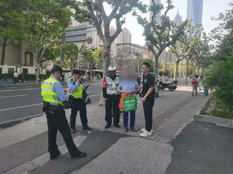 當日8時20分,郭明皓在吳中路虹梅路路口執(zhí)勤時,發(fā)現(xiàn)一位盲人老人在馬路中央艱難穿行,周圍車流密集,情況十分危險。他立即上前指揮車輛暫停,并迅速將老人攙扶至安全區(qū)域。經(jīng)詢問得知,老人需要乘坐69路公交車前往目的地。考慮到公交站臺距離較遠且路況復(fù)雜,為確保老人安全,郭明皓主動護送老人前往站臺。