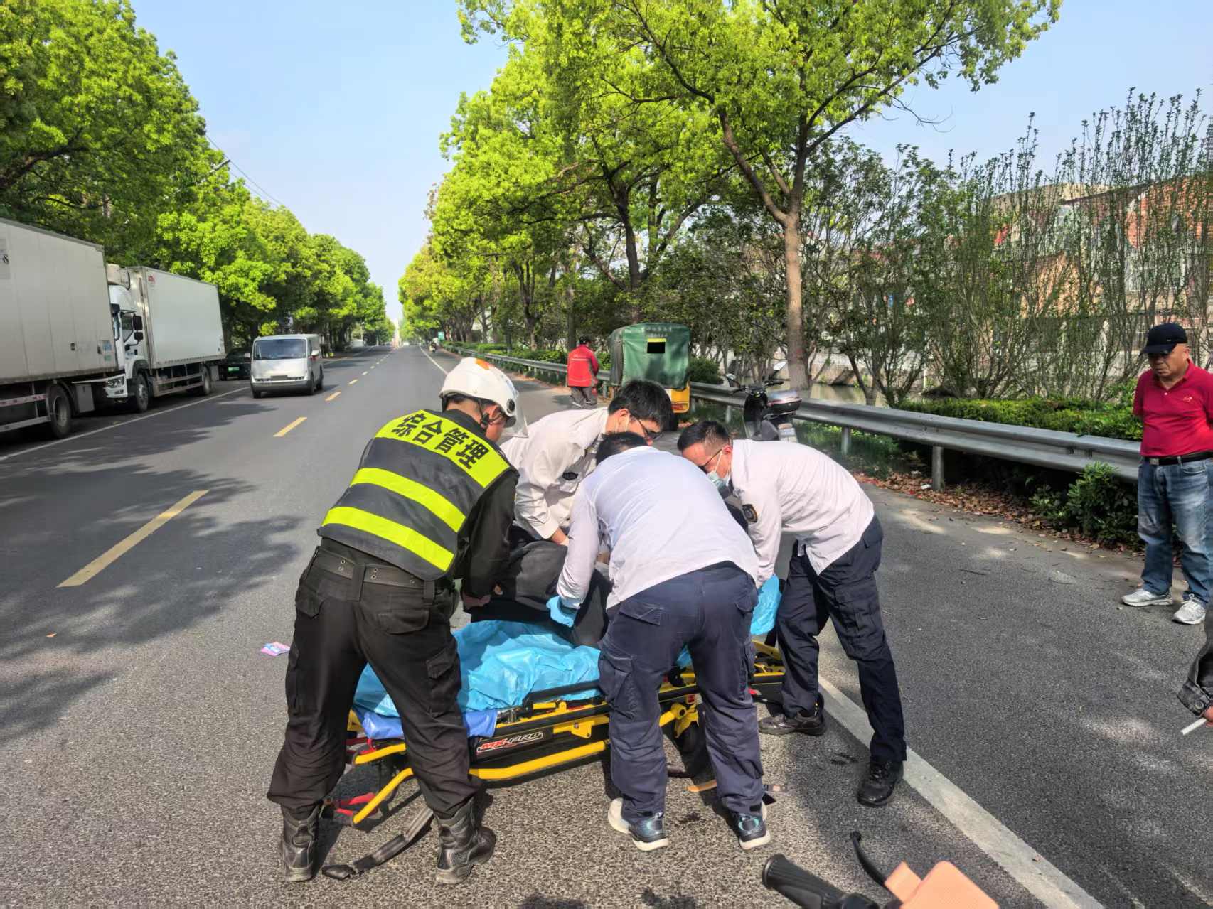 很快,120救護車抵達現(xiàn)場。兩人又主動協(xié)助醫(yī)護人員將傷者抬上救護車,幫助其及時送往醫(yī)院接受救治。待交警趕到后,黃建成和朱智龍積極配合調(diào)查,詳細說明了事發(fā)經(jīng)過,展現(xiàn)了高度的社會責任感和職業(yè)素養(yǎng)。