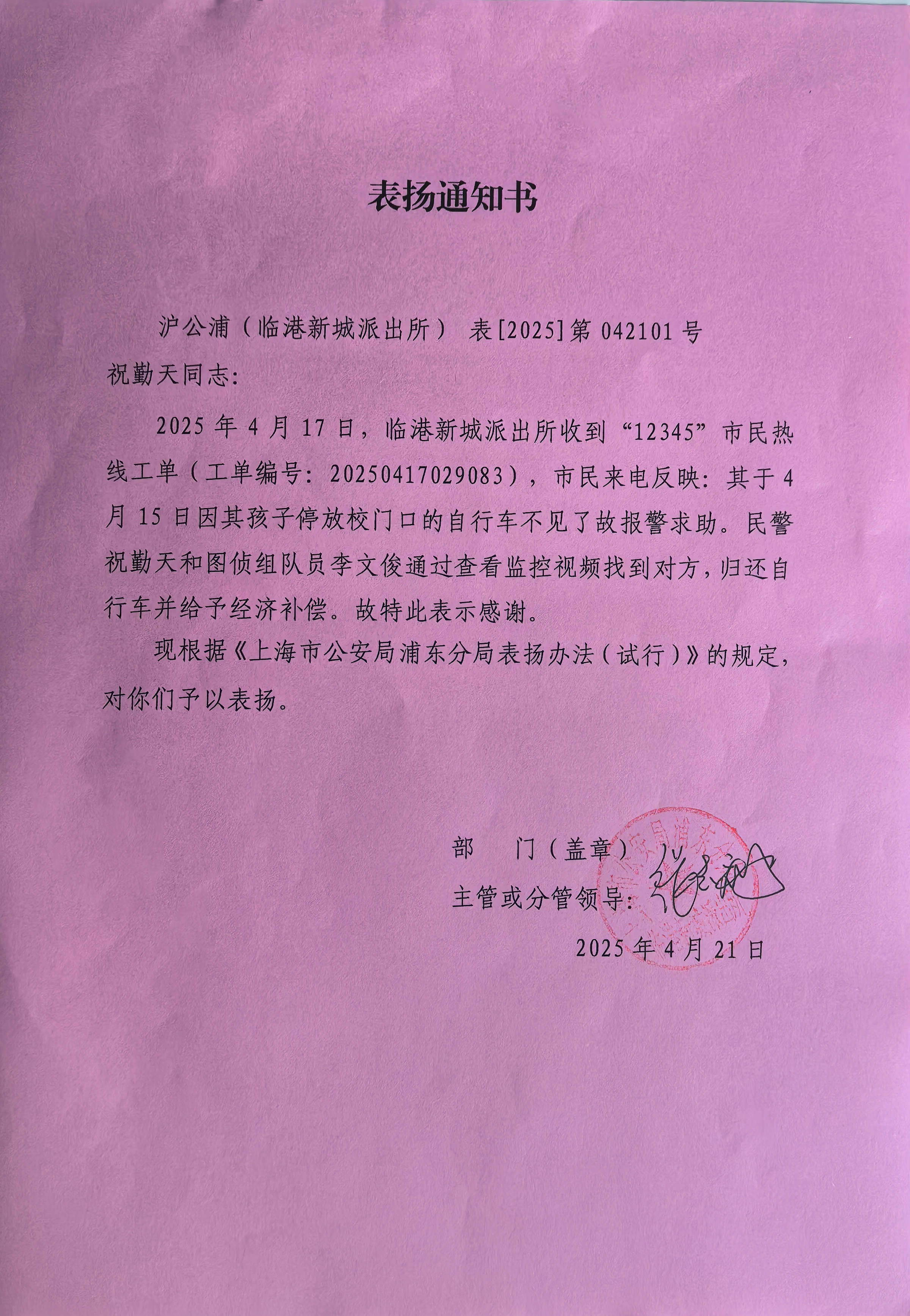 4月15日,宗保公司駐浦東新區(qū)臨港新城派出所輔助項(xiàng)目員工李文俊憑借高度的責(zé)任心和敏銳的洞察力,協(xié)助警方幫助市民李女士成功找回丟失的自行車。