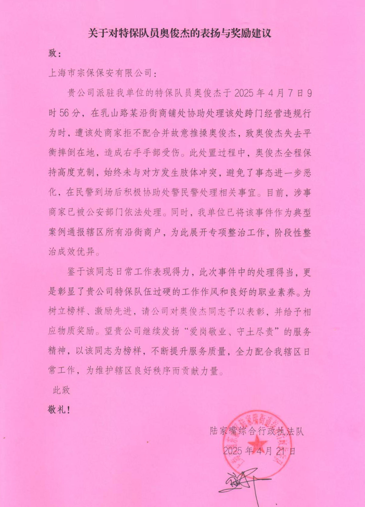 近日,宗保公司駐浦東新區(qū)陸家嘴社區(qū)市容項目員工奧俊杰因在工作中表現(xiàn)出高度的忍辱克制精神,受到陸家嘴綜合行政執(zhí)法隊的贊揚和獎勵。