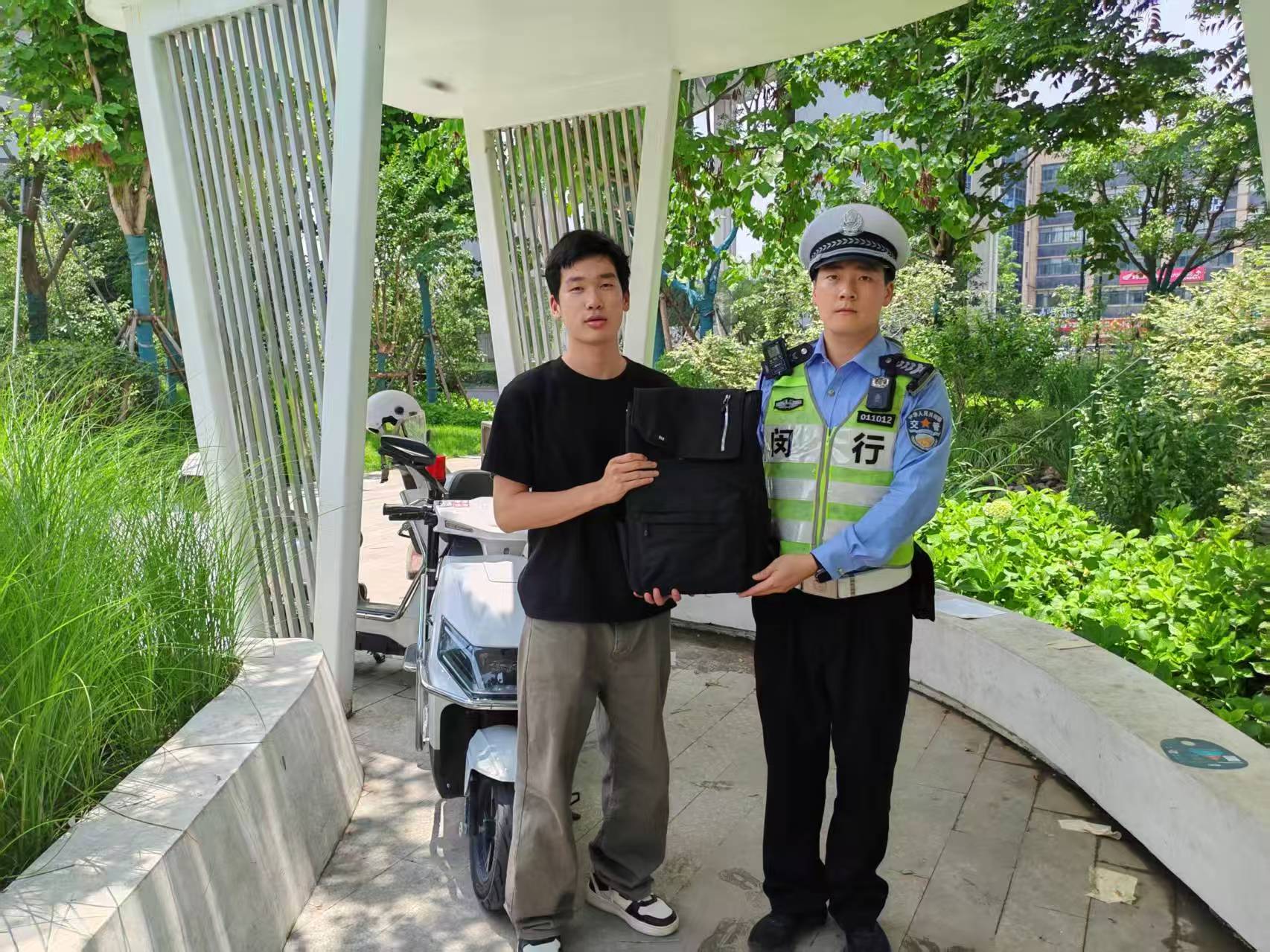 劉飛主動(dòng)上前詢問,男子說女兒把手提包忘記在單車筐里了,里面有購物卡現(xiàn)金等重要物品。