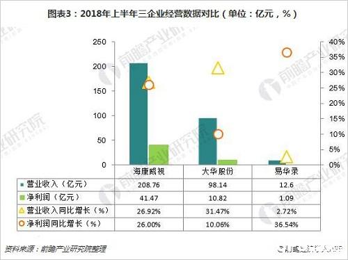 海康威視作為安防行業(yè)的老大,2018年上半年內(nèi)實(shí)現(xiàn)營(yíng)業(yè)收入208.76億元,同比增長(zhǎng)26.92%;實(shí)現(xiàn)凈利潤(rùn)41.47億元,同比增長(zhǎng)26.00%。雙增長(zhǎng)加上兩位數(shù)的增長(zhǎng)數(shù)字,毫無疑問海康威視交出了一份漂亮的答卷。大華股份緊隨其后,2018年上半年業(yè)績(jī)也相當(dāng)亮眼,公司實(shí)現(xiàn)營(yíng)業(yè)收入98.14億元,同比增長(zhǎng)31.47%,實(shí)現(xiàn)凈利潤(rùn)10.82億元,同比增長(zhǎng)10.06%。易華錄2018年上半營(yíng)業(yè)收入增長(zhǎng)2.72%,業(yè)績(jī)?cè)鲩L(zhǎng)較慢,但是凈利潤(rùn)增速冠絕群雄,達(dá)到36.54%。西部地區(qū)平安城市的建設(shè)項(xiàng)目無疑在拉動(dòng)三家企業(yè)業(yè)績(jī)和利潤(rùn)增長(zhǎng)過程中起到重要作用。