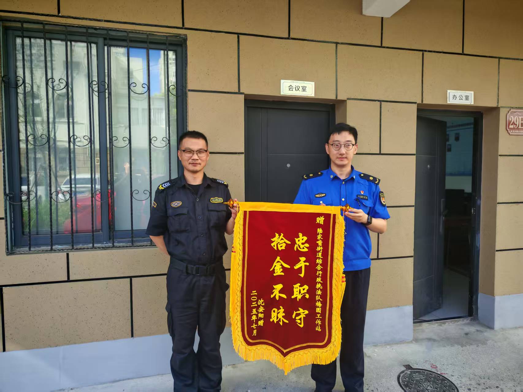 7月21日8:30,男子又特意趕到陸家嘴城管中隊(duì),送來一面繡有“拾金不昧 忠于職守”的錦旗,對(duì)宗保公司員工陳軍拾金不昧的行為表達(dá)誠(chéng)摯的謝意。 (供稿人:孫富超)06