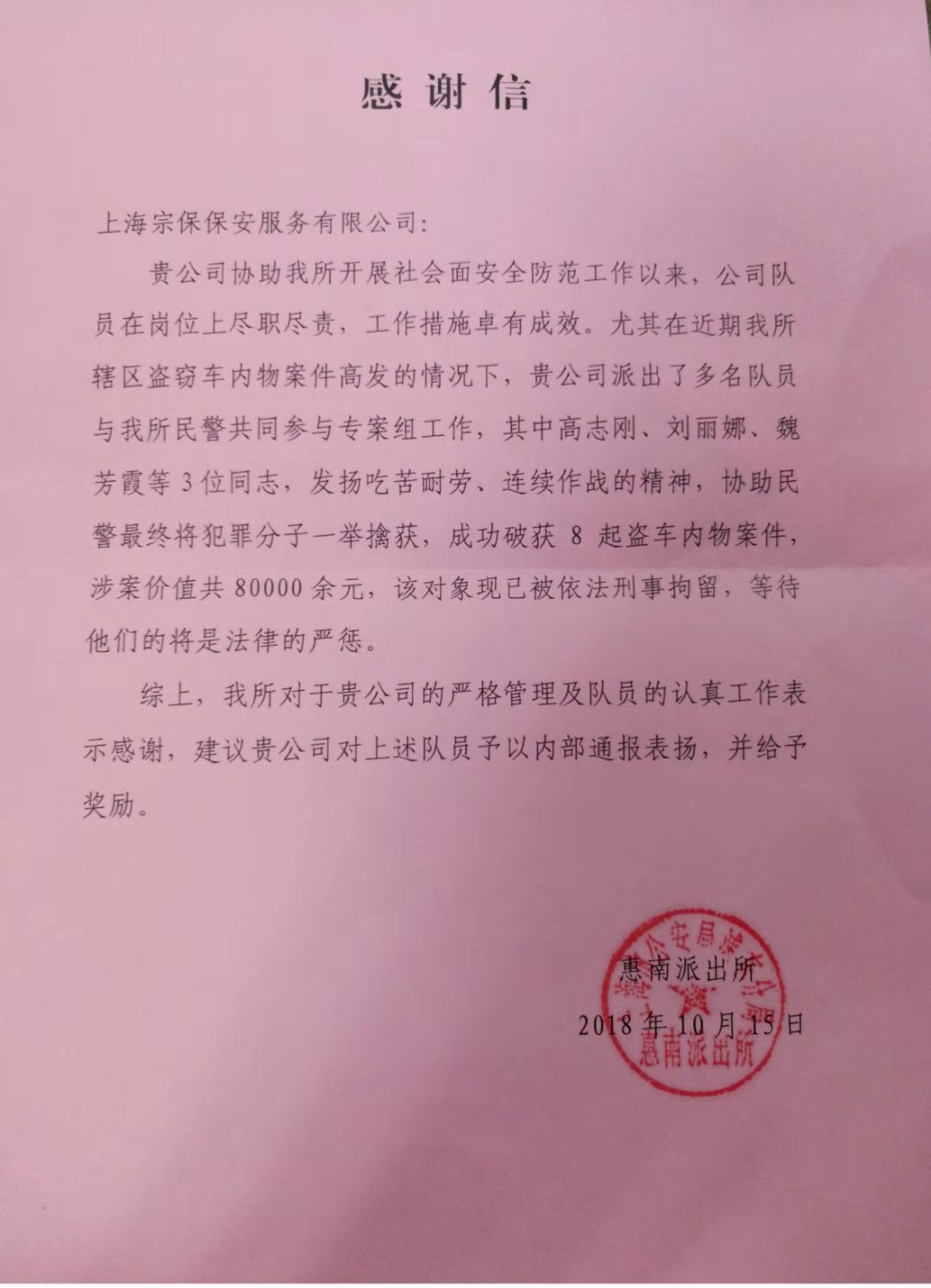 惠南派出所對宗保公司的嚴格管理及對他們工作上的大力支持深表感謝,對隊員們的認真工作表示認可及贊揚。事后惠南派出所還特意向宗保公司寫來了感謝信。