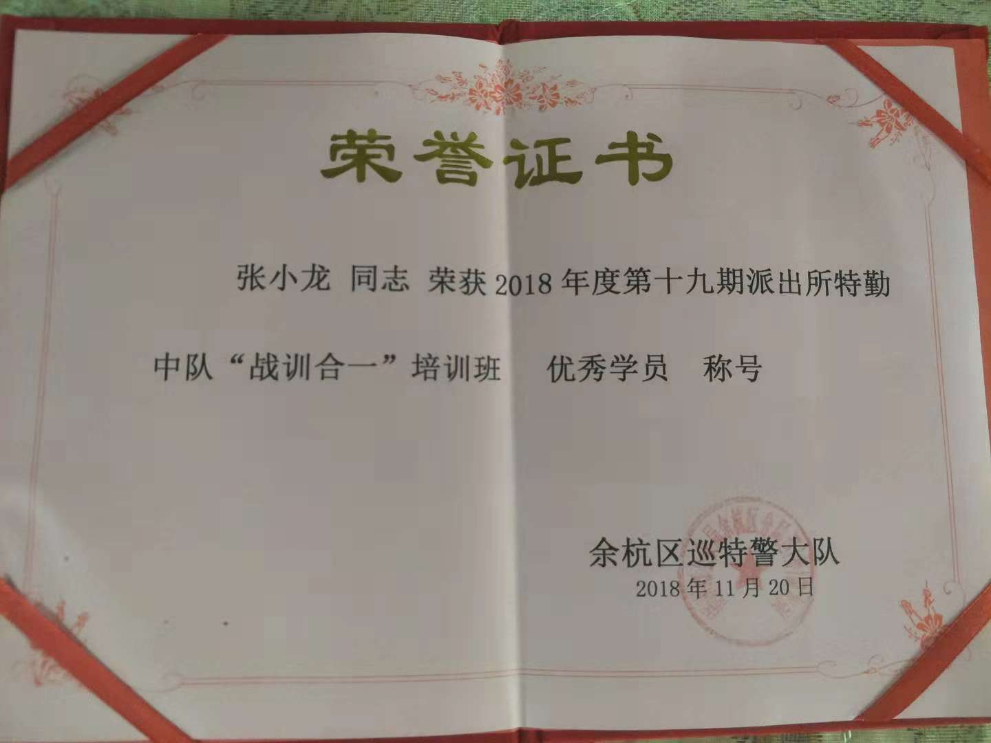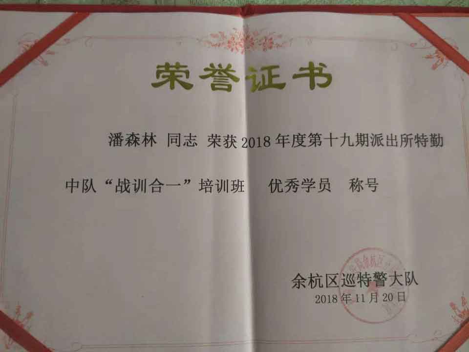 功夫不負(fù)有心人,經(jīng)過(guò)嚴(yán)格的理論考試和實(shí)戰(zhàn)考核,張小龍和潘森林二位學(xué)員表現(xiàn)尤為突出,榮獲了余杭區(qū)巡特警大隊(duì)頒發(fā)的榮譽(yù)證書(shū) —— 2018年度第十九期派出所特勤中隊(duì)“戰(zhàn)訓(xùn)合一”培訓(xùn)班優(yōu)秀學(xué)員稱(chēng)號(hào)。
