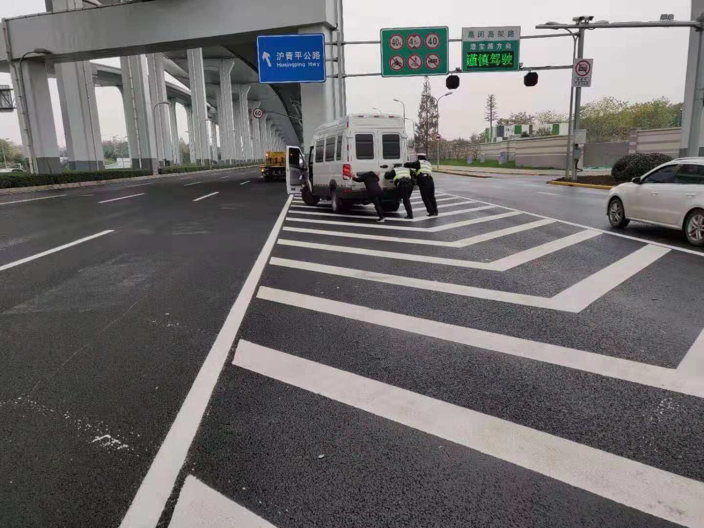 2018年12月9日,宗保駐閔行輔警項目隊員,將拋錨白色依維柯迅速撤離機(jī)動車道,保障道路通暢。