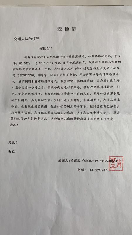 2018年12月27日17:00,肖女士的小孩從圖書館回家路途中不慎將手機丟失,肖女士懷著忐忑的心情撥通了遺失手機的號碼。電話那頭,拾到手機的宗保隊員鐘雨江告訴肖女士,在滬閔路和春中路路口等她。一個小時后肖女士趕到了約定的地點,當(dāng)時天已黑,只見一位身穿制服的年輕同志,站在寒風(fēng)中等候。肖女士表示非常感謝,拿出現(xiàn)金表示謝意,被宗保的小鐘婉言謝絕。