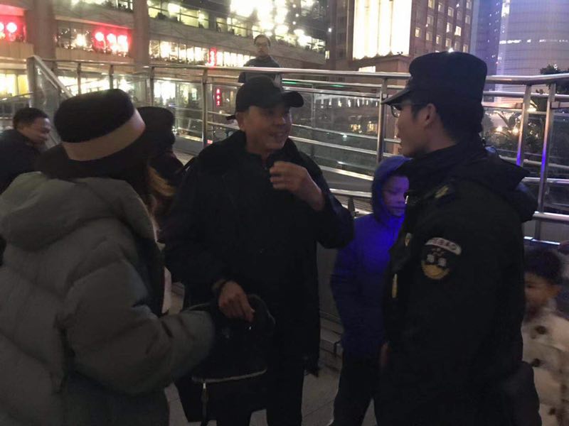 2018年12月31日晚20時25分,正在濱江區(qū)域安排大客流管控設(shè)卡工作的特保隊長余澤權(quán)接到當天值班所長夏志松的協(xié)查指令,說濱江哈根達斯附近有增援民警求助,現(xiàn)場有游客家屬走丟,要求我們趕到現(xiàn)場處置。接到這一指令后,余澤權(quán)帶領(lǐng)濱江段執(zhí)勤班長王曉盼與隊員張雅坤趕赴現(xiàn)場,找到當事人后通過了解,當事人一家在濱江親水平臺處與其父親走散,電話聯(lián)系不通,而且都是第一次來到小陸家嘴區(qū)域游玩,對地方不熟悉。