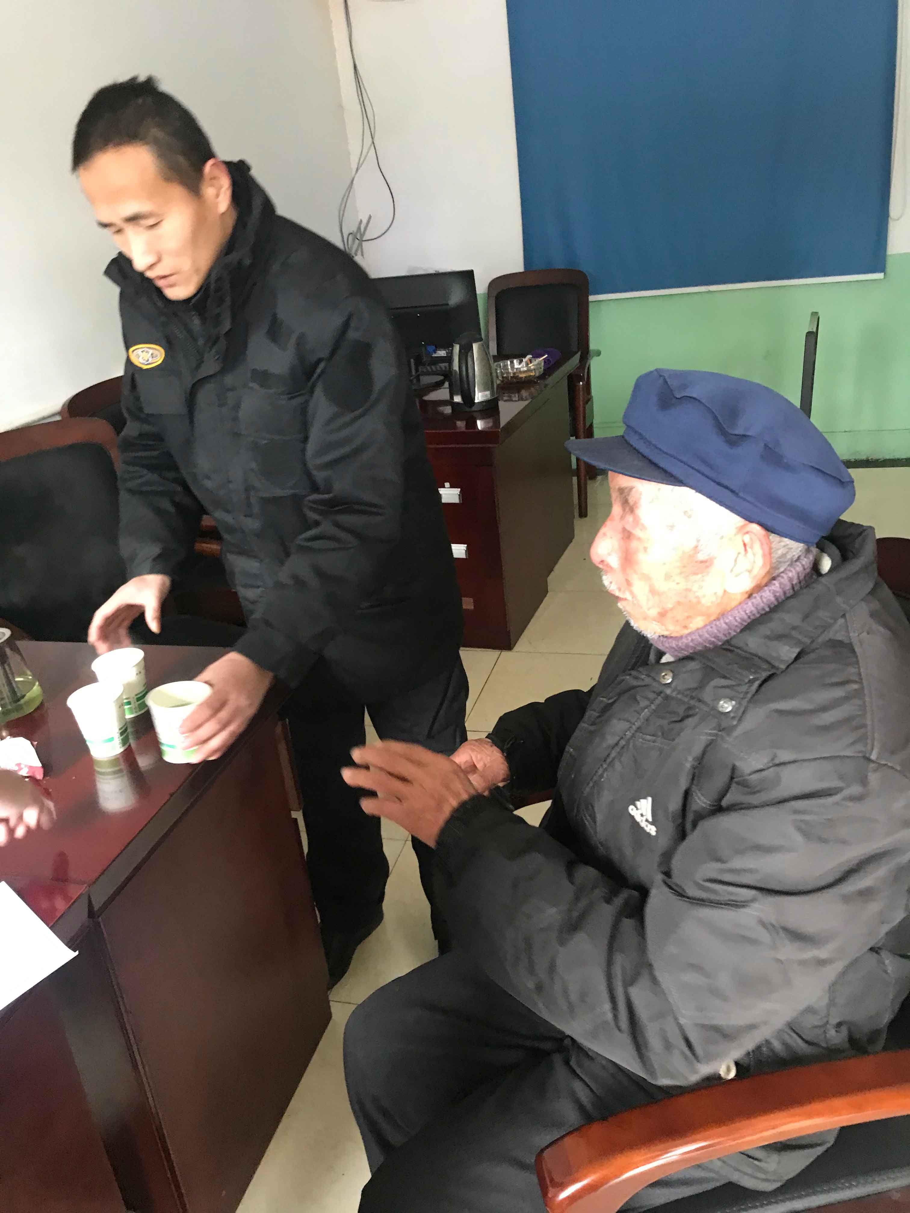 2018年12月31日,宗保隊員王華奇、王付振等正在大團基地安排工作時,一輛外來車輛駛?cè)牖厮奚崽帯I锨傲私馇闆r,是熱心群眾在南團公路碰到一位迷路老人,送來這尋求幫助。