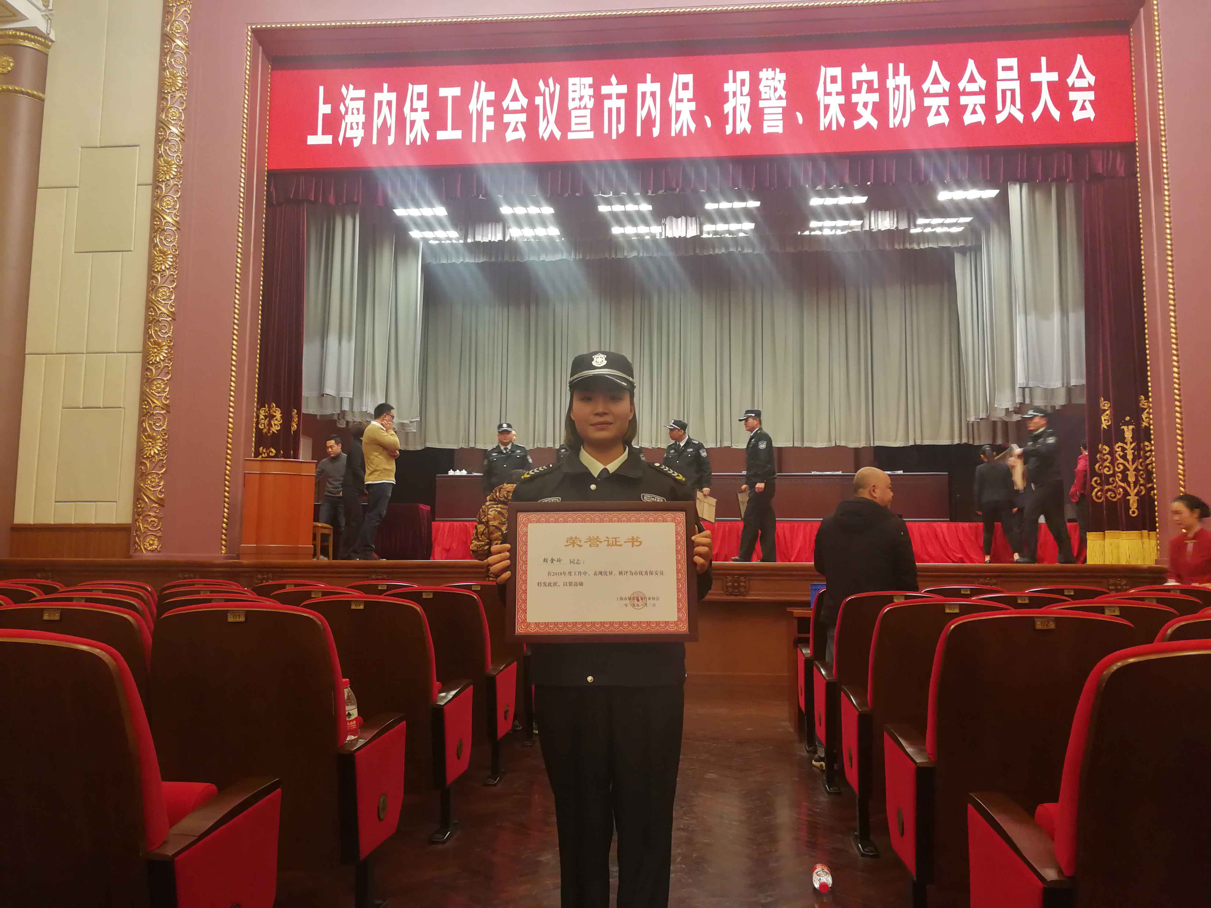 2019年1月3日下午,上海內保工作會議暨市內保、報警、保安協會會員大會在上海展覽中心舉行。會上,我司祝橋江鎮(zhèn)市容項目負責人胡金玲被評為“2018年度上海市保安系統(tǒng)十佳保安員”的榮譽稱號。