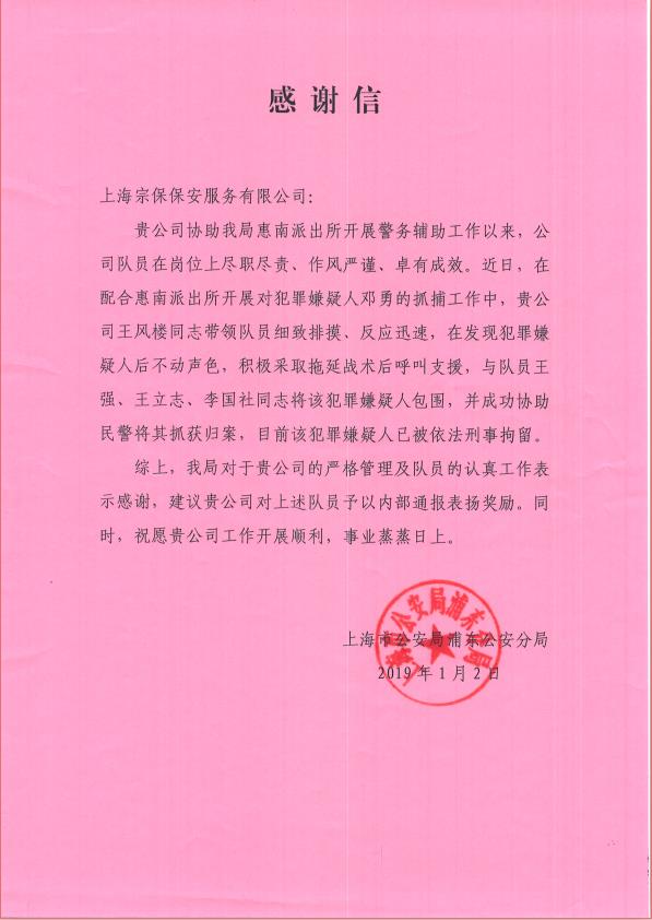 2019年1月2日,新年上班第一天,宗保保安公司收到來自于上海市公安局浦東分局的一封感謝信。