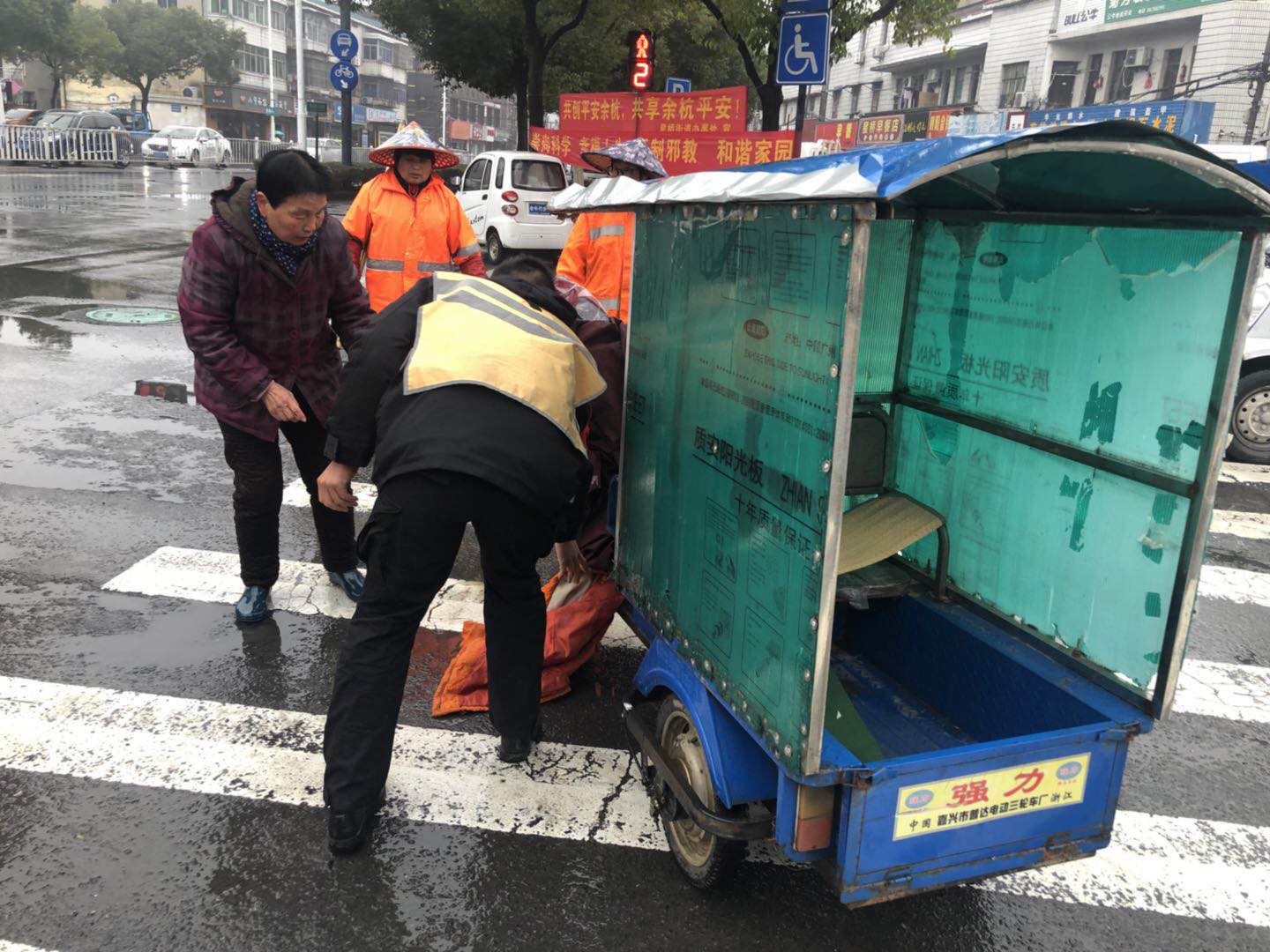 2019年1月15日上午9點(diǎn)30分左右,浙江民泰駐星橋市容項(xiàng)目隊(duì)長陳佳寶和隊(duì)員孫慧洋在藕花洲大街巡查時(shí),發(fā)現(xiàn)一名老婆婆由于雨天路滑,電瓶車側(cè)翻壓在身上,無法動(dòng)彈躺在路上,無人幫忙。
