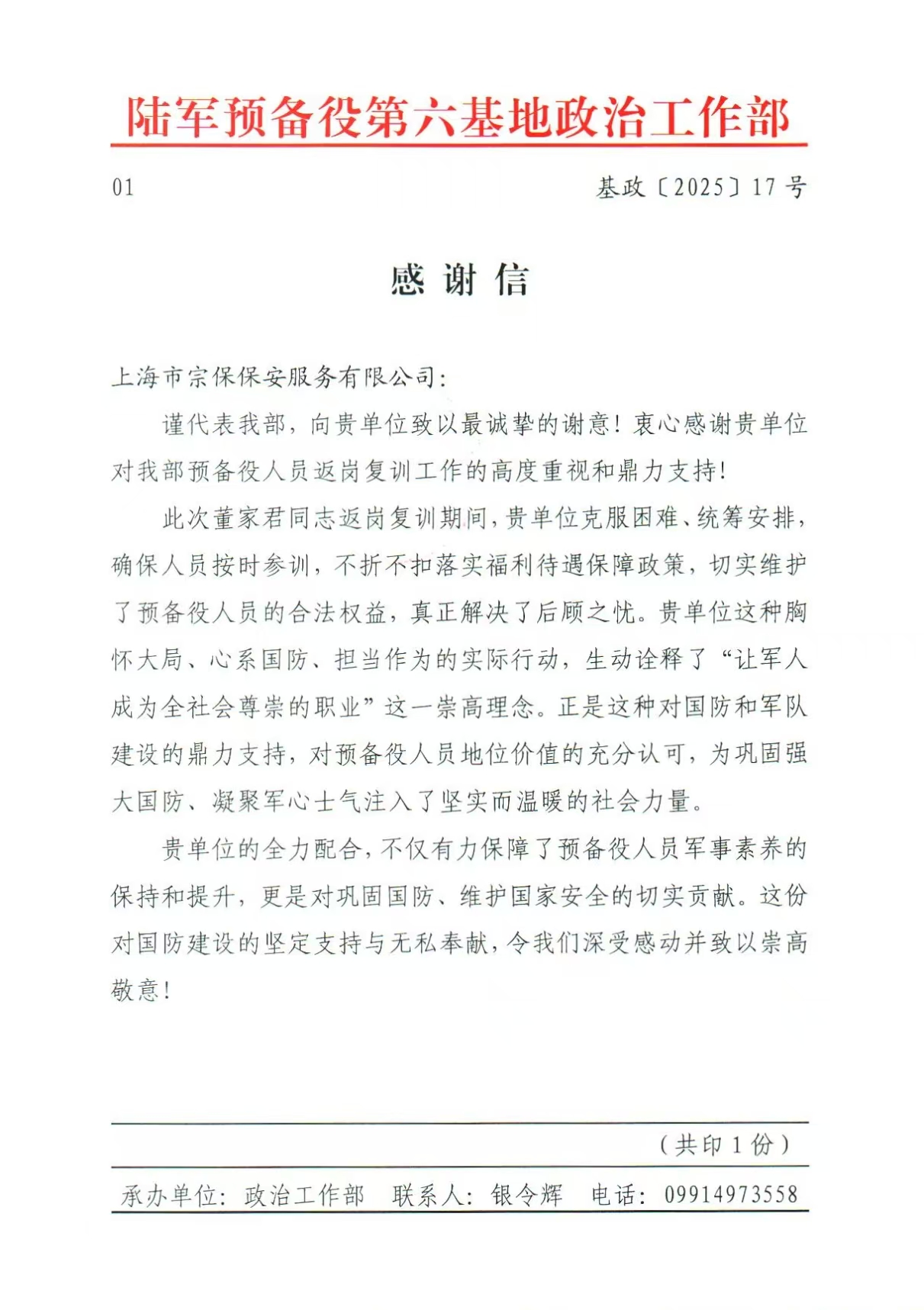 1宗保公司收到陸軍預(yù)備役第六基地政治工作部的感謝信