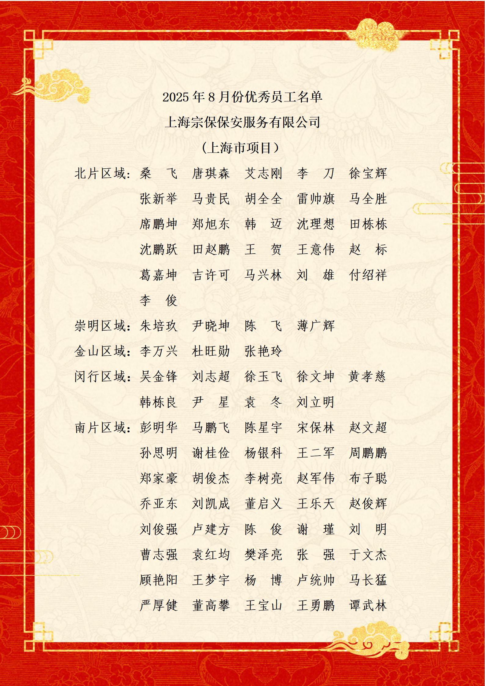 8月份,公司廣大員工根據(jù)甲方的任務(wù)要求,按照公司的部署安排,認(rèn)真踐行公司“規(guī)范經(jīng)營 誠信為本 服務(wù)至上”的發(fā)展理念,頂著烈日冒著酷暑,堅守崗位勤勉作為,助力完成了上海藍(lán)鯨世界購物中心開業(yè)交通秩序維護等多項大型活動安保任務(wù),全力配合甲方做好了城市管理輔助、治安巡邏聯(lián)防、物業(yè)服務(wù)保障、生態(tài)環(huán)境保護、高鐵線路巡防等工作。期間,涌現(xiàn)出了一批盡心履責(zé)、崗位建功、拾金不昧、熱心助人的優(yōu)秀員工和先進典型。
