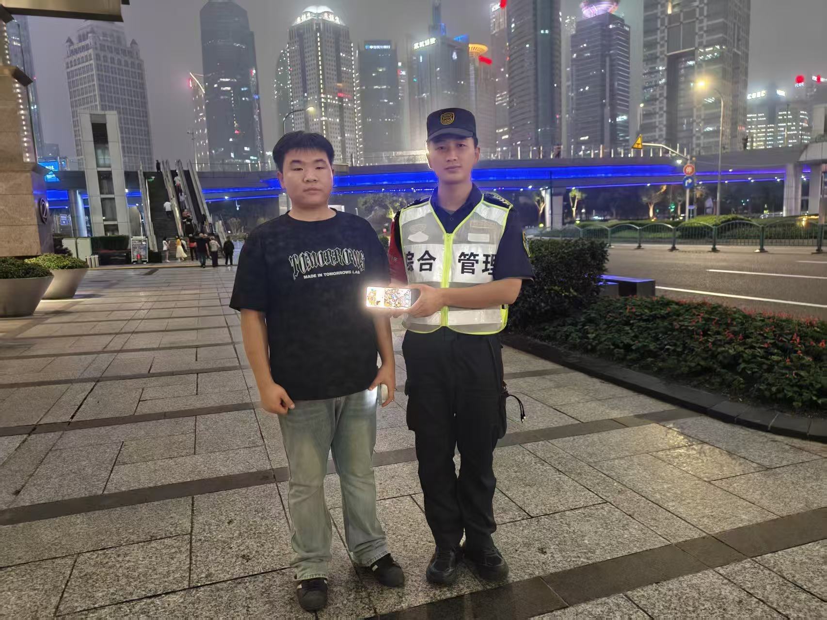 10月13日20:50,宗保公司駐浦東新區(qū)陸家嘴綜合管理項(xiàng)目員工文亞樂(lè)在金茂大廈附近巡邏時(shí),撿到一部魅族手機(jī)。由于手機(jī)設(shè)有鎖屏密碼,一時(shí)無(wú)法聯(lián)系失主,文亞樂(lè)便留在原地邊巡邏邊等待失主。