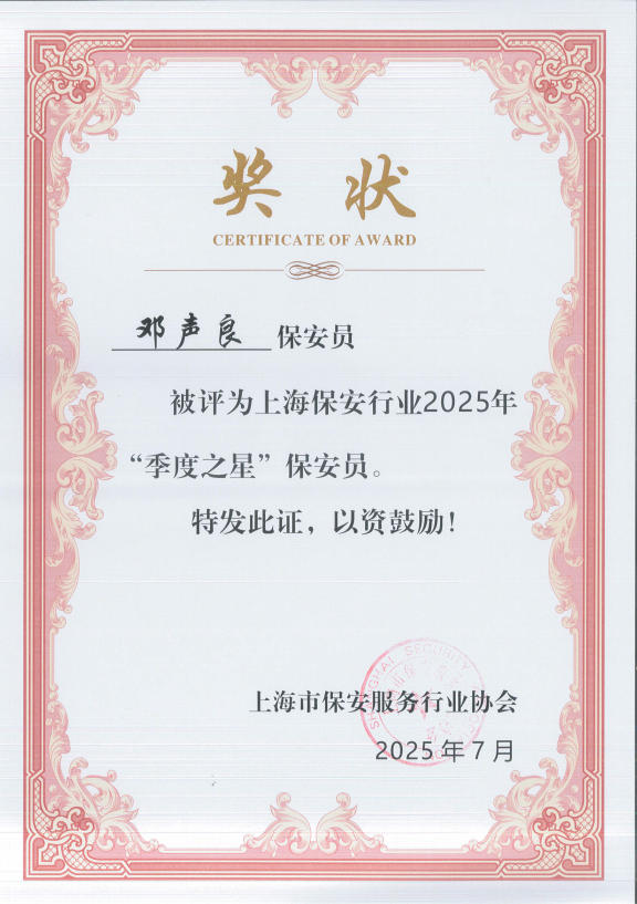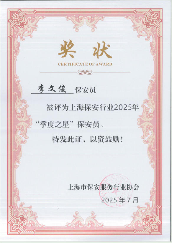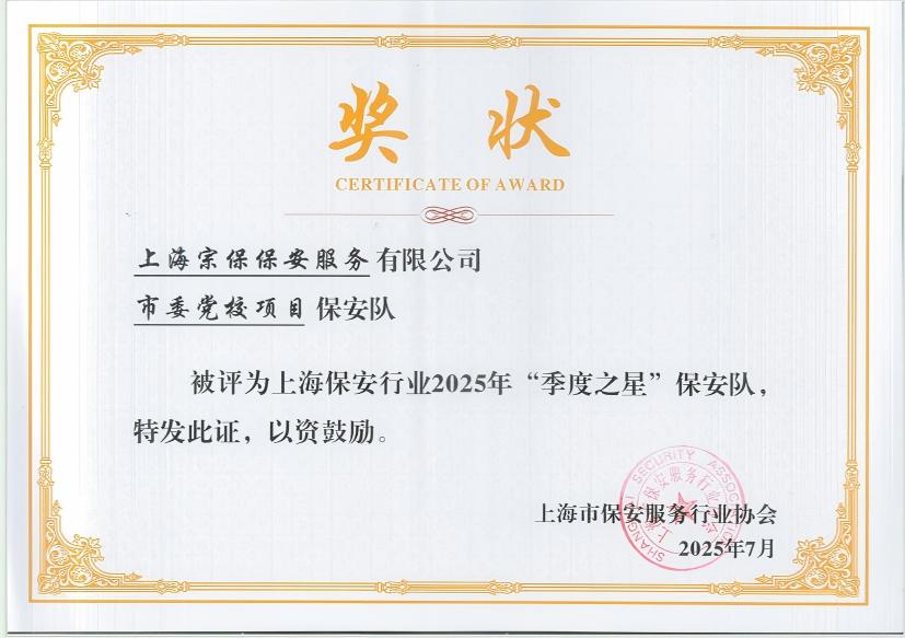 近日,上海市保安服務(wù)行業(yè)協(xié)會公布了上海保安行業(yè)2025年第二季度優(yōu)秀保安隊、保安員展示名單,宗保公司1個項目保安隊和3名員工個人獲此殊榮。