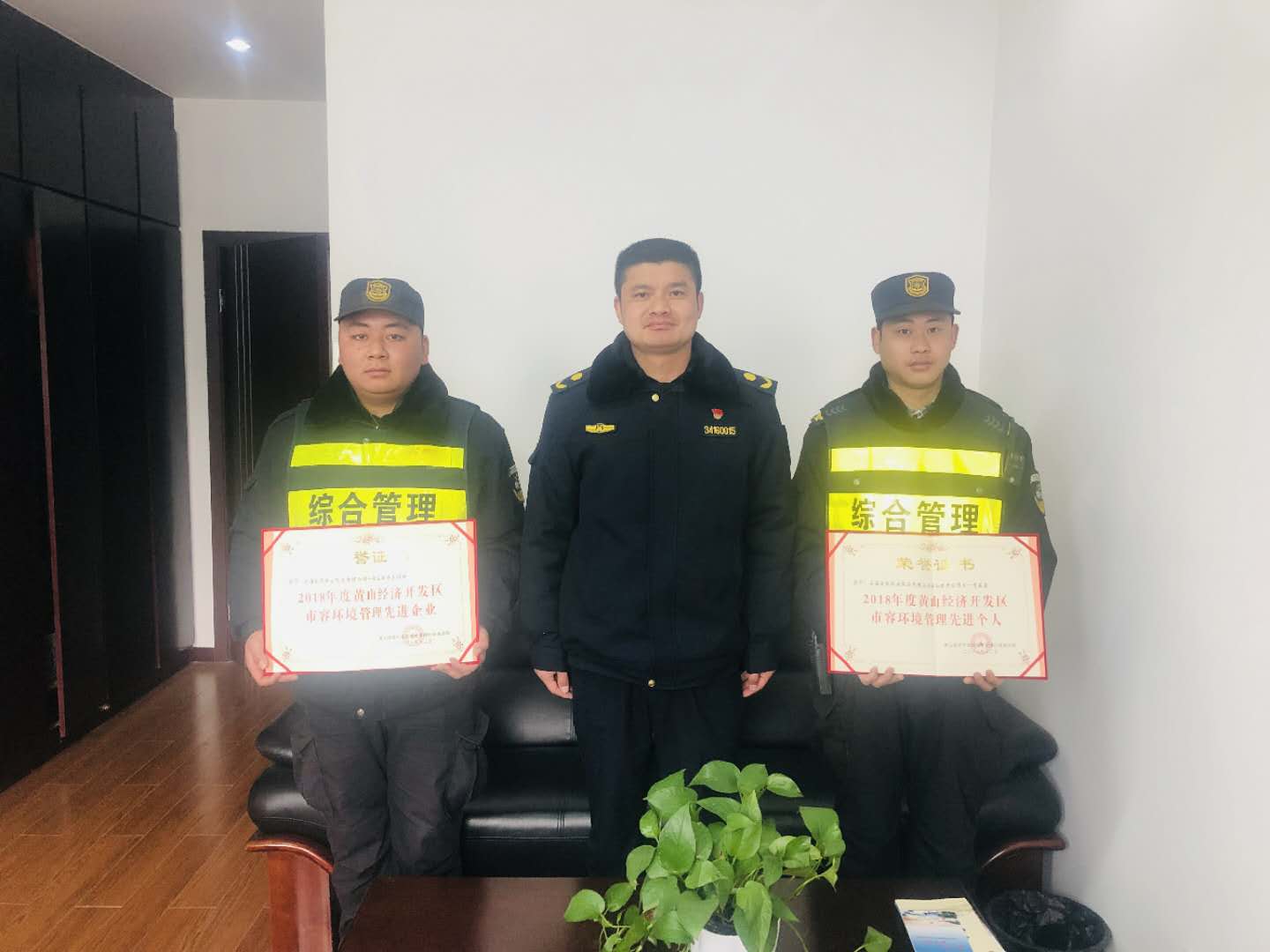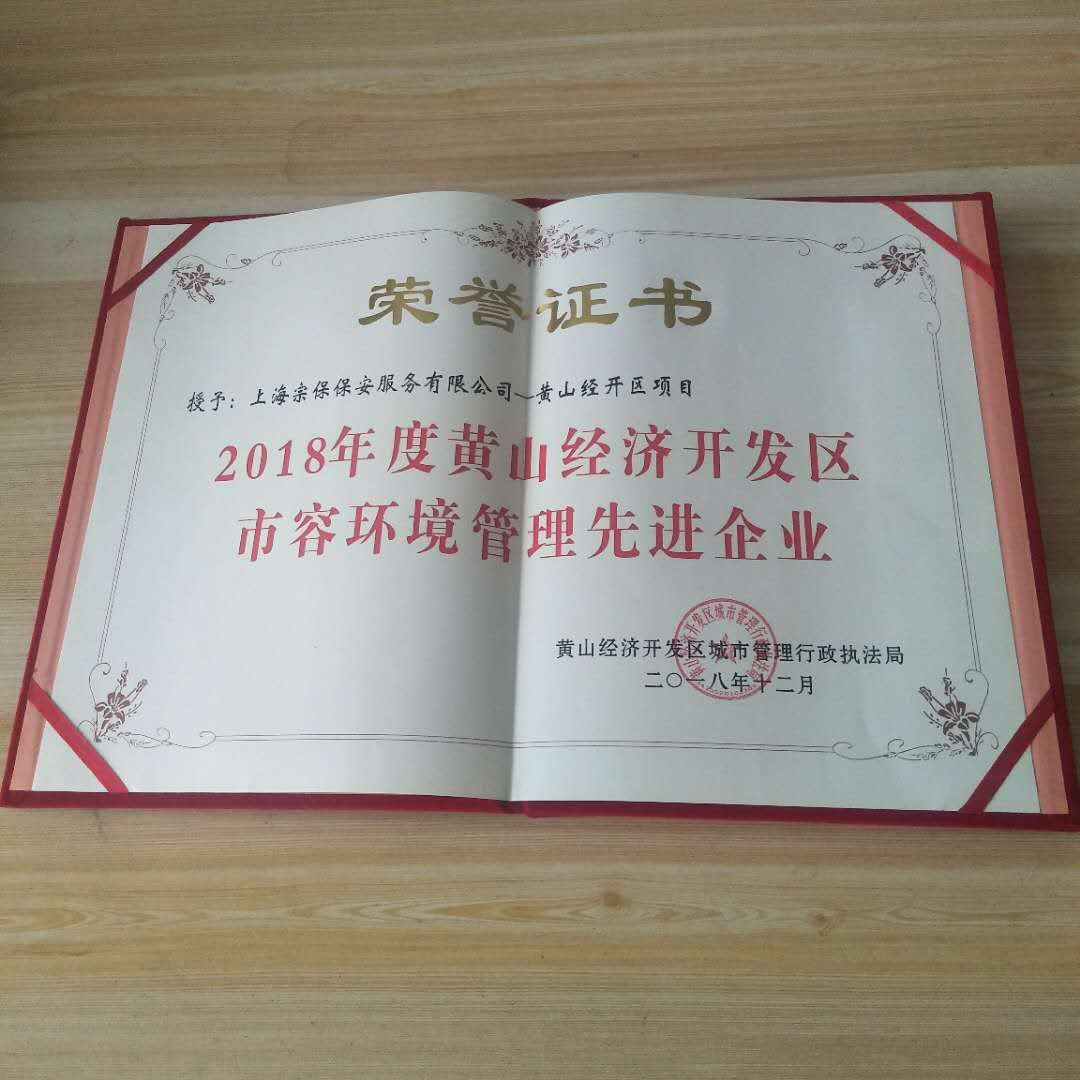 2019年2月2日,黃山經(jīng)濟(jì)開(kāi)發(fā)區(qū)城市管理行政執(zhí)法局劉局長(zhǎng),為上海宗保頒發(fā)“2018年度黃山經(jīng)濟(jì)開(kāi)發(fā)區(qū)市容環(huán)境管理先進(jìn)企業(yè)”及“2018年度黃山經(jīng)濟(jì)開(kāi)發(fā)區(qū)市容管理先進(jìn)個(gè)人”榮譽(yù)證書
