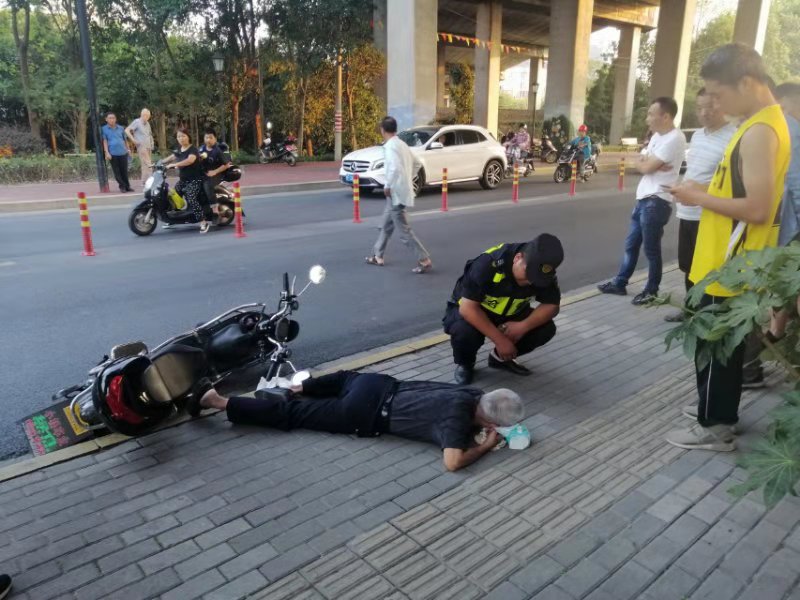 當(dāng)天下午16:50左右,小張像往常一樣緊張有序地執(zhí)勤,當(dāng)巡查到紅豐立交橋崗位時看到前面一群人圍觀,第一反應(yīng)可能出事了。小張急忙走上前,只見一位大爺騎電車摔倒在地。