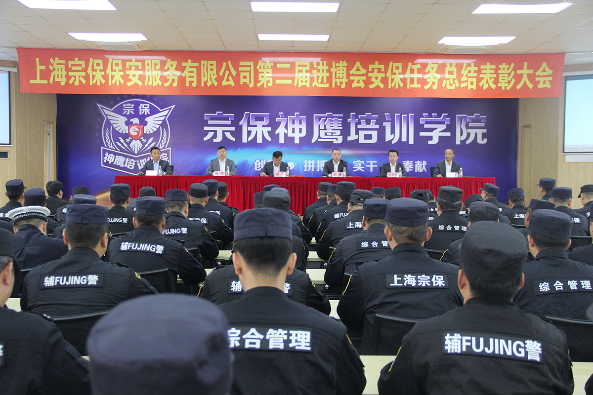 11月23日上午,上海宗保保安服務有限公司在訓練基地禮堂隆重召開“第二屆中國國際進口博覽會”安保工作總結(jié)表彰大會,公司領(lǐng)導、區(qū)域經(jīng)理、項目負責人以及受到表彰的優(yōu)秀個人共140余人參加會議。