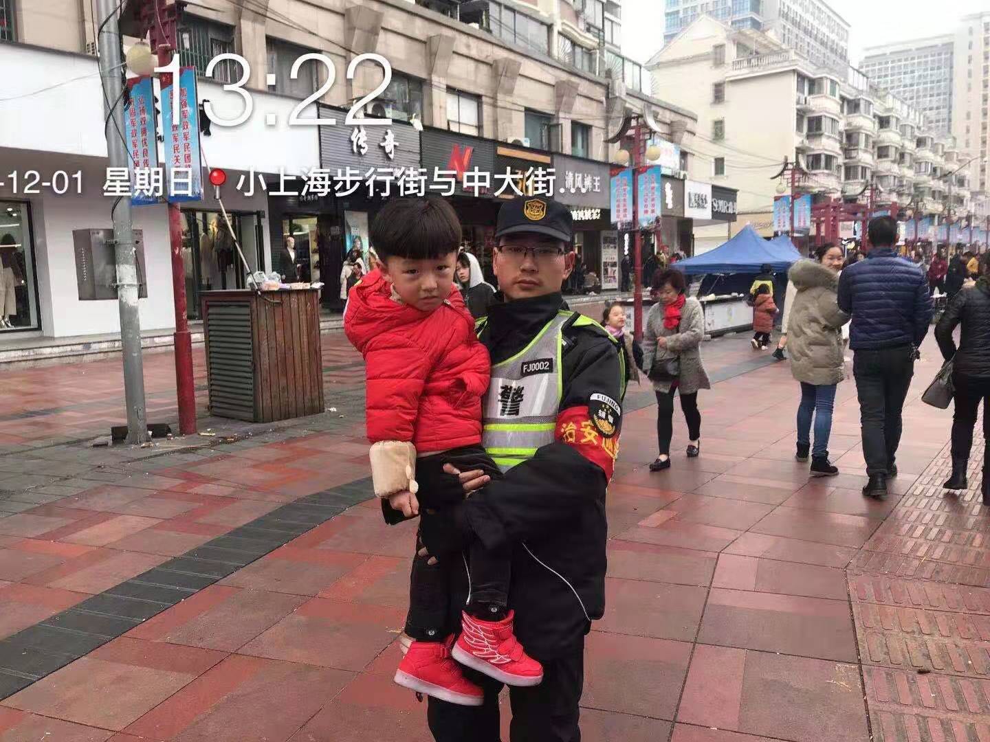 12月1日,周浦輔警隊(duì)員王云強(qiáng)13:22分巡邏至步行街121號正新雞排店門口時,發(fā)現(xiàn)一個小男孩一直在哭泣,旁邊沒有家長看護(hù)。于是,就上前詢問,得知小男孩和媽媽一起出來逛街,自己只顧玩,走著走著就找不到媽媽了,所以急得哭了起來。