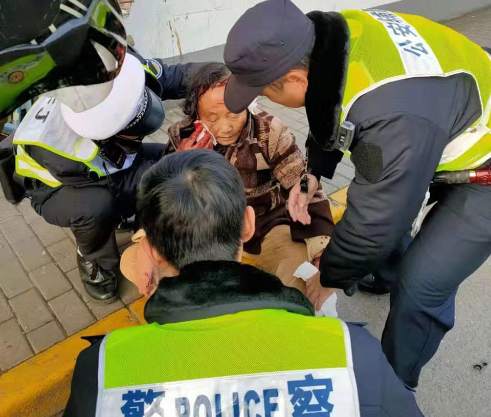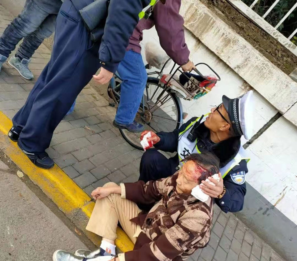 當(dāng)天上午9:25,小鄭在滬閔路蓮花崗值勤時,看到一位老人騎車摔倒,就急忙跑過去,老人頭部受傷,血流不止。小鄭一方面報告值班民警,另一方面聯(lián)系120急救車。