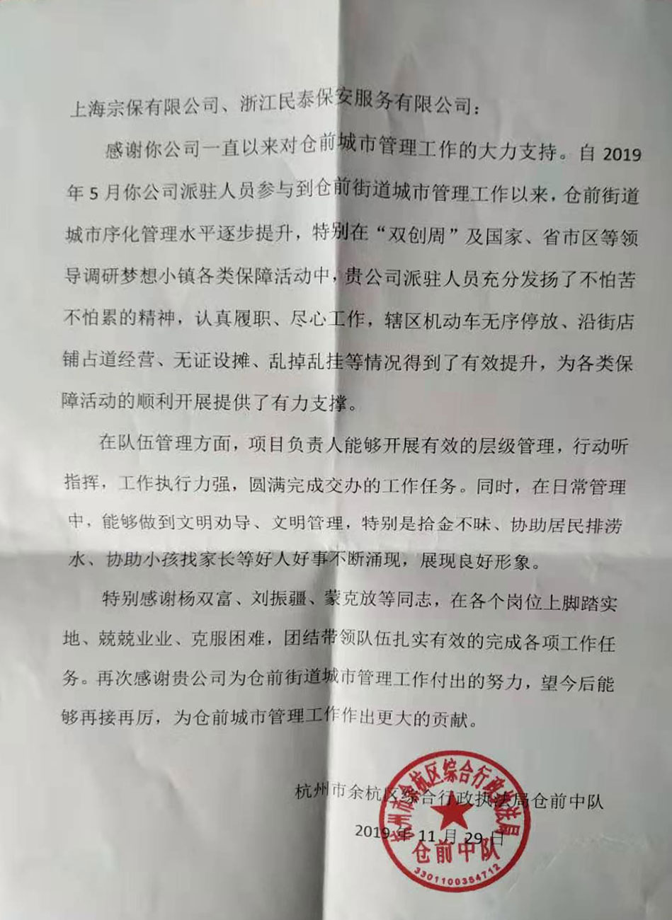 12月12日,臨平城管中隊(duì)送來(lái)表?yè)P(yáng)信,對(duì)浙江民泰駐該所項(xiàng)目的特保隊(duì)進(jìn)行表?yè)P(yáng)。