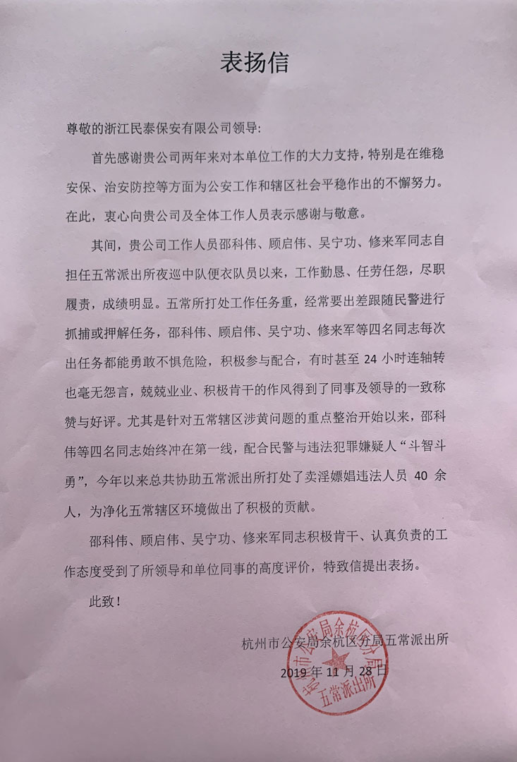 11月28日,杭州市余杭區(qū)五常派出所送來(lái)表?yè)P(yáng)信,對(duì)浙江民泰駐該所輔警項(xiàng)目的邵科偉、顧啟偉、吳寧功、修來(lái)軍等4名隊(duì)員點(diǎn)名表?yè)P(yáng)。