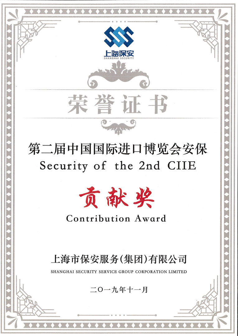 2019年11月29日,第二屆中國國際進(jìn)口博覽會安保項(xiàng)目加盟商表彰大會在上海市保安服務(wù)(集團(tuán))有限公司舉行,上海宗保保安服務(wù)有限公司榮獲貢獻(xiàn)獎。