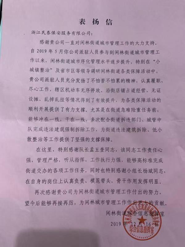 12月16日,浙江民泰公司收到一封來自閑林街道綜合信息指揮室的表揚(yáng)信,對公司駐閑林城管項(xiàng)目隊(duì)伍半年來的工作表示肯定和贊揚(yáng)。