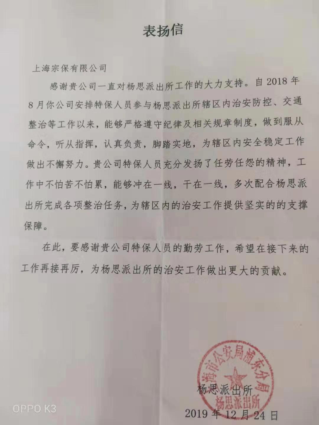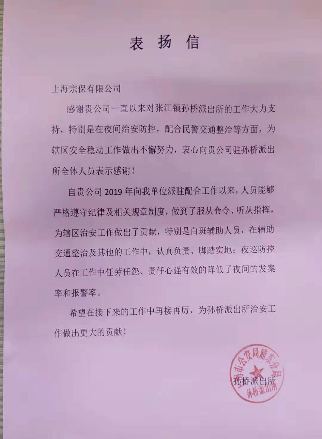 12月23日,上海宗保公司收到一封來自浦東公安分局孫橋派出所的表揚(yáng)信,對公司駐該所輔警項(xiàng)目隊(duì)伍全年工作表示肯定和感謝,希望再接再厲,做出更大貢獻(xiàn)。