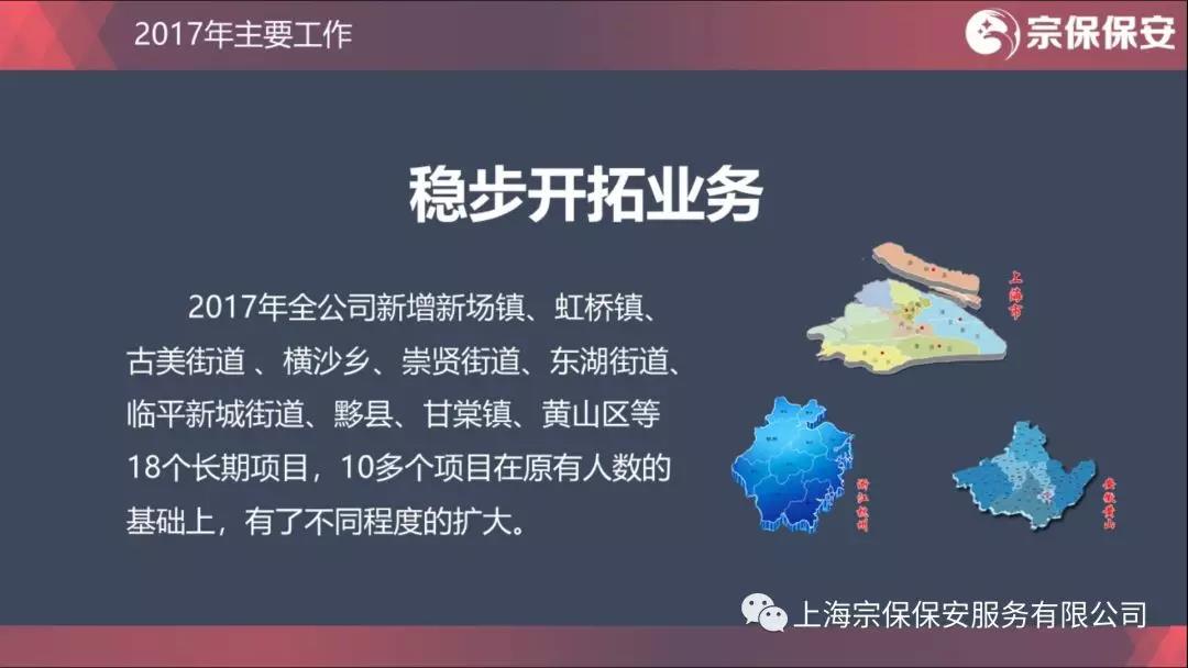 2017年全公司新增新場(chǎng)鎮(zhèn)、虹橋鎮(zhèn)、古美街道 、橫沙鄉(xiāng)、崇賢街道、東湖街道、臨平新城街道、黟縣、甘棠鎮(zhèn)、黃山區(qū)等18個(gè)長(zhǎng)期項(xiàng)目,10多個(gè)項(xiàng)目在原有人數(shù)的基礎(chǔ)上,有了不同程度的擴(kuò)大。2017年公司合同人數(shù)增加1000多人。這是公司連續(xù)第9年業(yè)績(jī)穩(wěn)步增長(zhǎng),年年邁大步、年年上臺(tái)階。公司人數(shù)的增加,不是簡(jiǎn)單數(shù)量上的增長(zhǎng),而是一批批隊(duì)員的合格、一位位骨干的成熟、一個(gè)個(gè)項(xiàng)目的過硬。