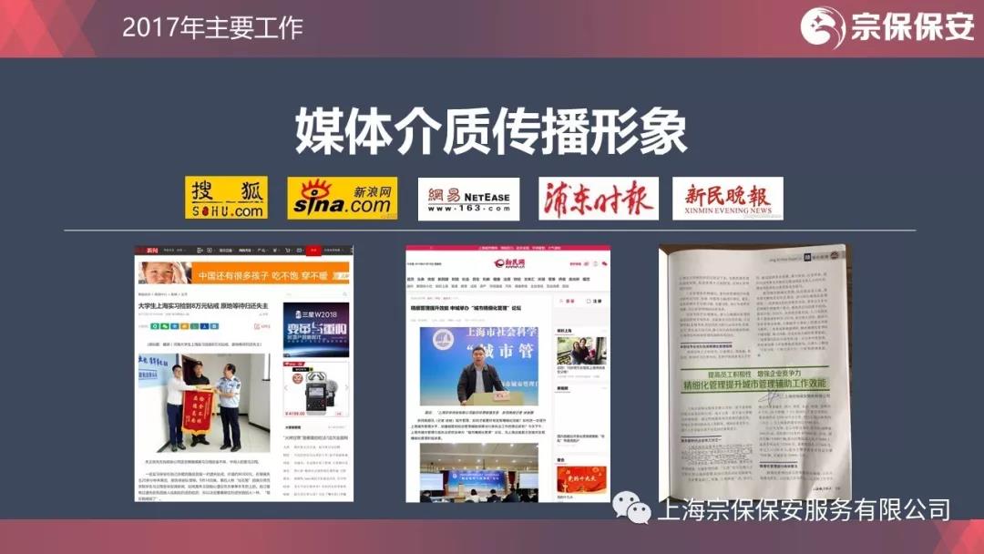酒香不怕巷子深,由風(fēng)做介質(zhì);好事照樣傳千里,靠媒體傳播。2017年,搜狐網(wǎng)、新浪網(wǎng)、網(wǎng)易、中國新聞網(wǎng)、《新民晚報(bào)》、《浦東日?qǐng)?bào)》、《上海城管執(zhí)法》、《保安與技防》等多家媒體相繼報(bào)道公司的正面形象。媒體紛至而來,既是社會(huì)各界對(duì)宗保人踏實(shí)工作、文明值勤的認(rèn)可,更是宗保企業(yè)文化這壇佳釀不斷發(fā)酵、香飄久遠(yuǎn)所致。
