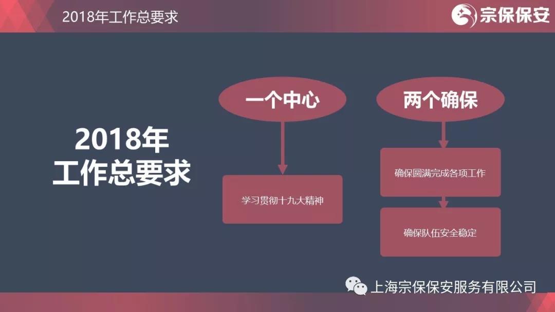 激情和汗水成就過去,理性和堅(jiān)強(qiáng)鑄就未來。2018年,公司總體要求是抓住一個(gè)中心,守住兩個(gè)確保。一個(gè)中心就是學(xué)習(xí)貫徹十九大精神。十九大報(bào)告指出,要不斷滿足人民日益增長(zhǎng)的美好生活需要,習(xí)近平總書記在上海提出的“讓城市更有序、更安全、更干凈”,這都對(duì)我們的工作提出了新的更高的要求。兩個(gè)確保就是確保圓滿完成甲方交給的各項(xiàng)工作,確保隊(duì)伍安全穩(wěn)定。前者是使命所系、職責(zé)所在,沒有這個(gè)確保,公司和隊(duì)員就沒有存在的價(jià)值和作用;后者是根本保證和依托,沒有這個(gè)確保,一切工作都是空話,只能是水中月、鏡中花。