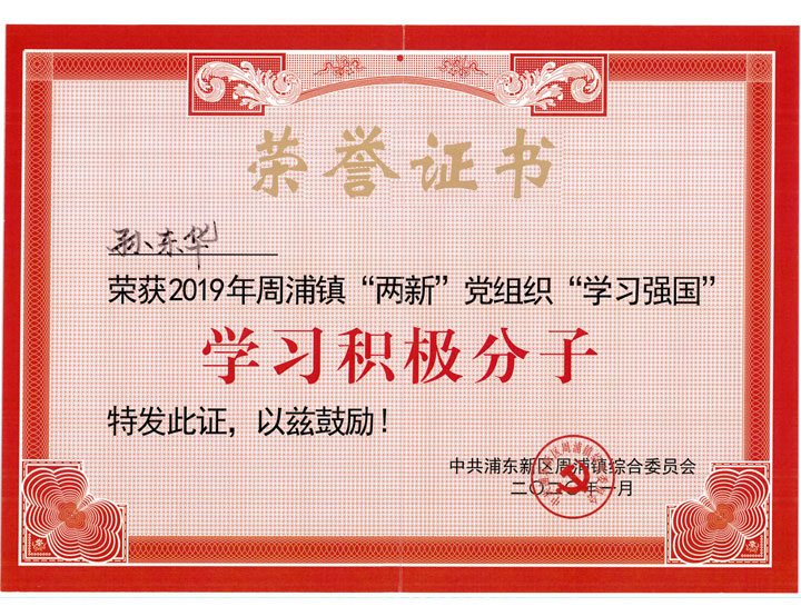 2020年1月3日,浙江民泰公司副總經(jīng)理孫東華被浦東新區(qū)周浦鎮(zhèn)評為2019年“兩新”黨組織“學(xué)習(xí)強國”學(xué)習(xí)積極分子,受到表彰。
