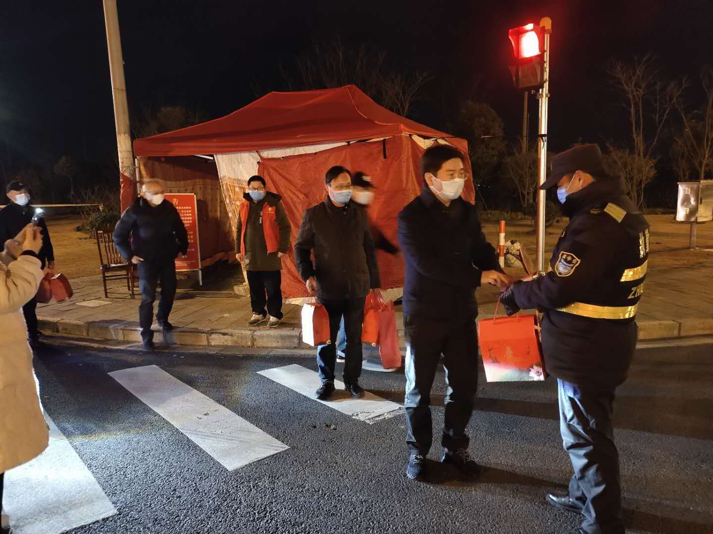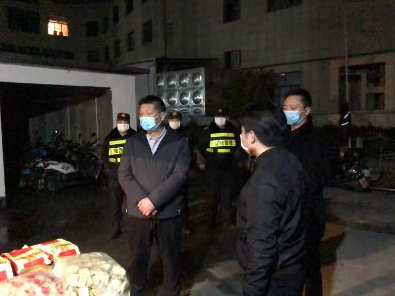 2月17日晚,張江鎮(zhèn)政法書記潘艷萍現(xiàn)場檢查指導疫情防控工作,看望慰問疫情防控一線的宗保員工。