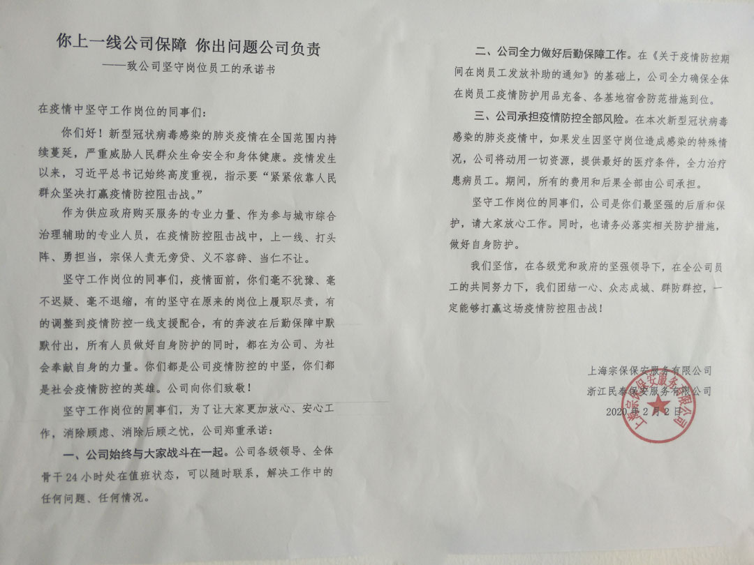 出臺(tái)制度規(guī)定,堅(jiān)定員工戰(zhàn)“疫”決心。經(jīng)公司董事會(huì)研究,下發(fā)《關(guān)于疫情防控期間在崗員工發(fā)放補(bǔ)助的通知》,向疫情中堅(jiān)守崗位的員工發(fā)放特殊補(bǔ)助,讓員工切實(shí)得實(shí)惠。發(fā)出《你上一線公司保障,你出問題公司負(fù)責(zé)》致公司堅(jiān)守崗位員工的承諾書,向堅(jiān)守崗位的員工做出莊重承諾:如果因疫情中堅(jiān)守崗位發(fā)生病毒感染的,公司將全力治療患病員工,所有的費(fèi)用和后果全部由公司承擔(dān)。