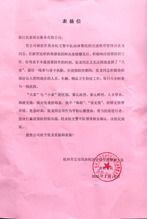 2月23日,浙江民泰公司收到一封杭州市余杭區(qū)臨平城管中隊(duì)送來的表揚(yáng)信。信中,贊揚(yáng)了公司駐該城管中隊(duì)項(xiàng)目隊(duì)員在疫情防控中的工作表現(xiàn),感謝隊(duì)員們的辛勤付出。