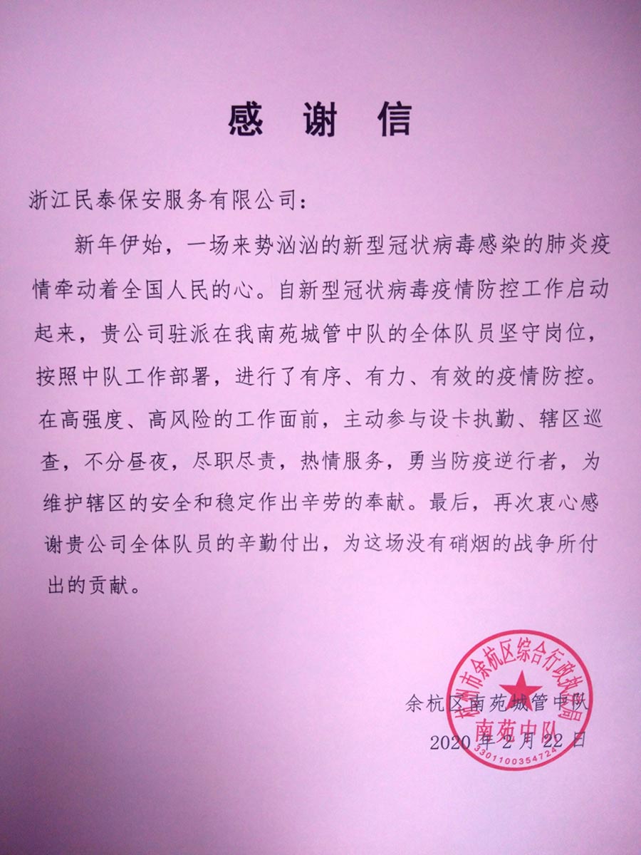 2月22日,杭州市余杭區(qū)南苑城管中隊(duì)送來感謝信,表揚(yáng)浙江民泰公司駐該中隊(duì)項(xiàng)目隊(duì)員在疫情防控中的工作表現(xiàn),感謝隊(duì)員們的辛勤付出。