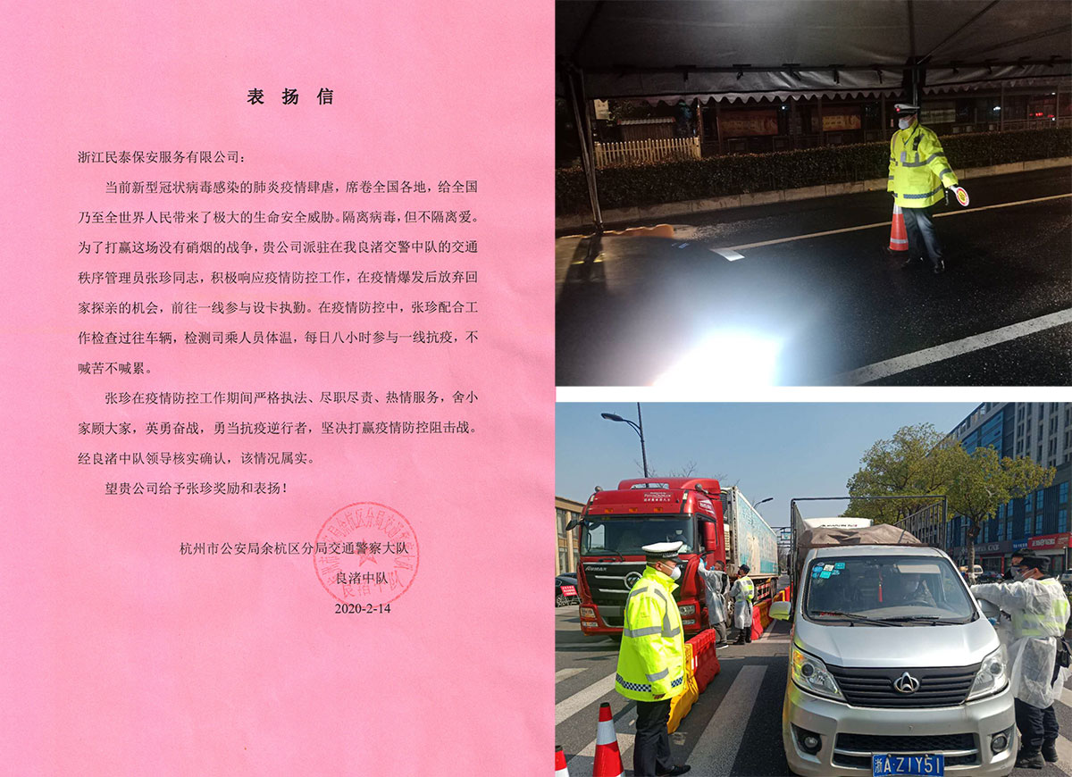 2月14日,杭州市公安局余杭區(qū)分局良渚交警中隊(duì)送來2封表揚(yáng)信,表揚(yáng)浙江民泰駐該中隊(duì)交通輔警項(xiàng)目的李堅(jiān)和張珍在疫情防控中的工作表現(xiàn)。