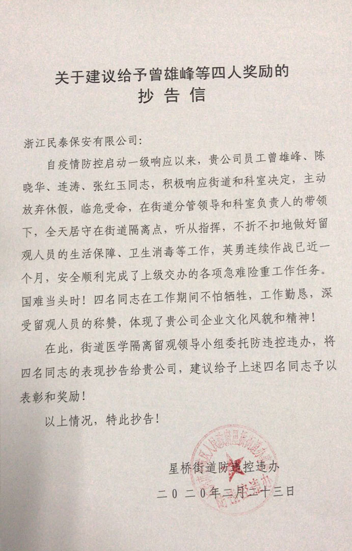 2月23日,杭州市余杭區(qū)星橋街道防違控違辦送來抄告信,點(diǎn)名表揚(yáng)浙江民泰公司駐該項(xiàng)目的曾雄峰、陳曉華、連濤、張紅玉等4名隊(duì)員,建議給予4名隊(duì)員表彰獎勵。