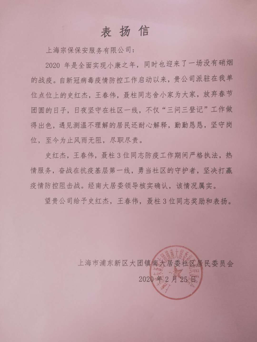 2月25日,宗保公司收到浦東新區(qū)大團(tuán)鎮(zhèn)南大居委社區(qū)的表揚(yáng)信,表揚(yáng)公司駐大團(tuán)項(xiàng)目的史紅杰、王春偉、聶柱三名隊(duì)員在疫情防控中的工作表現(xiàn)。