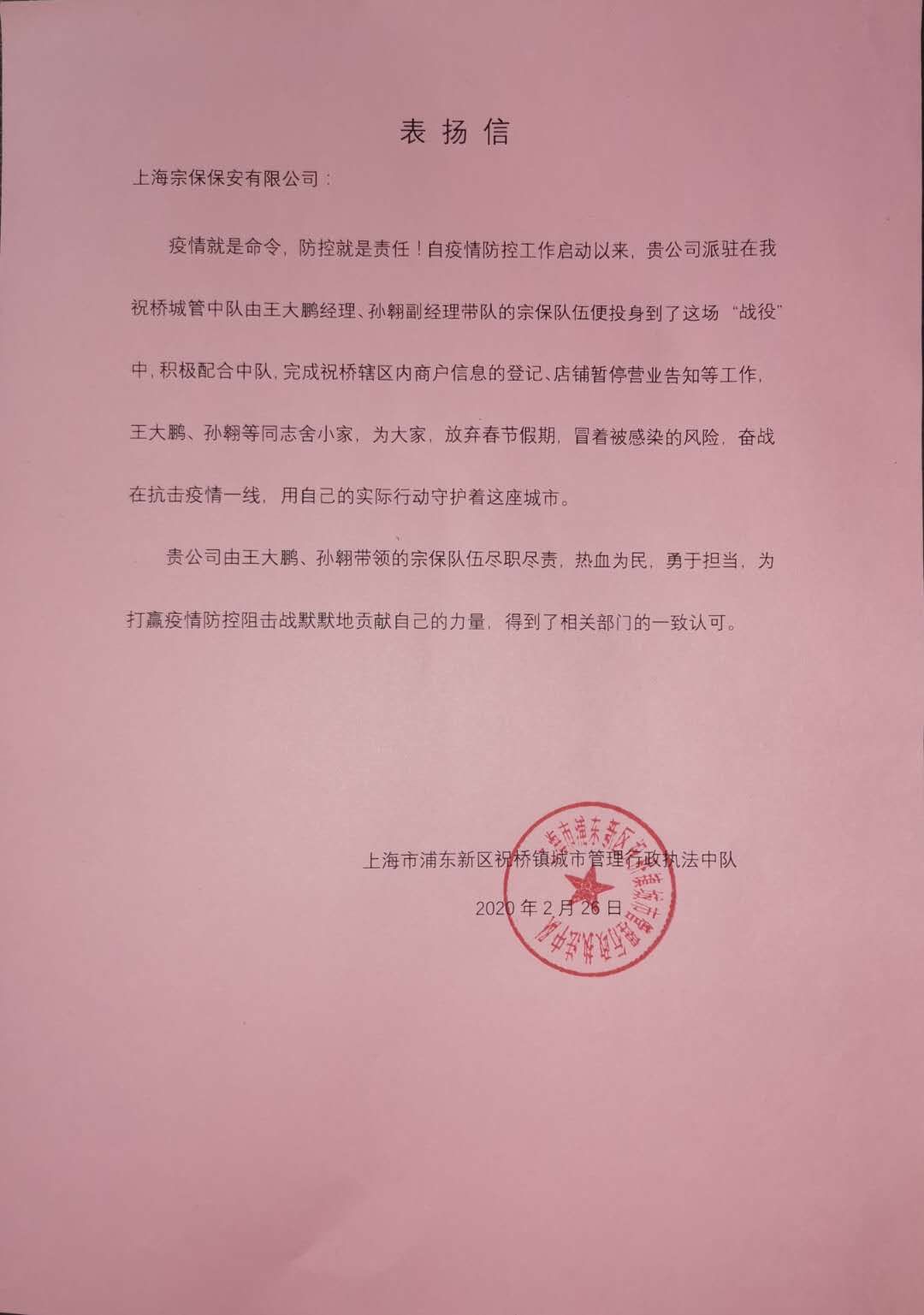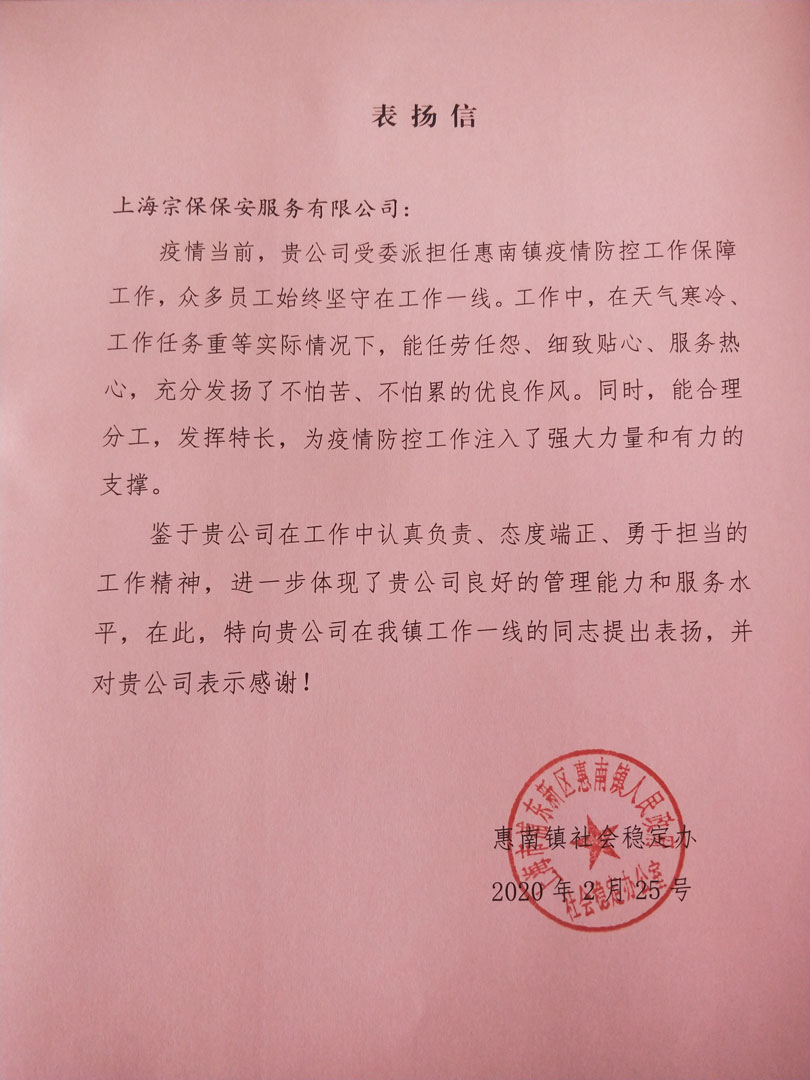 2月25日,浦東新區(qū)惠南鎮(zhèn)穩(wěn)定辦送來表揚(yáng)信,表揚(yáng)宗保公司駐惠南市容項(xiàng)目全體隊(duì)員在疫情防控中認(rèn)真負(fù)責(zé)、態(tài)度端正、勇于承擔(dān)的工作精神。