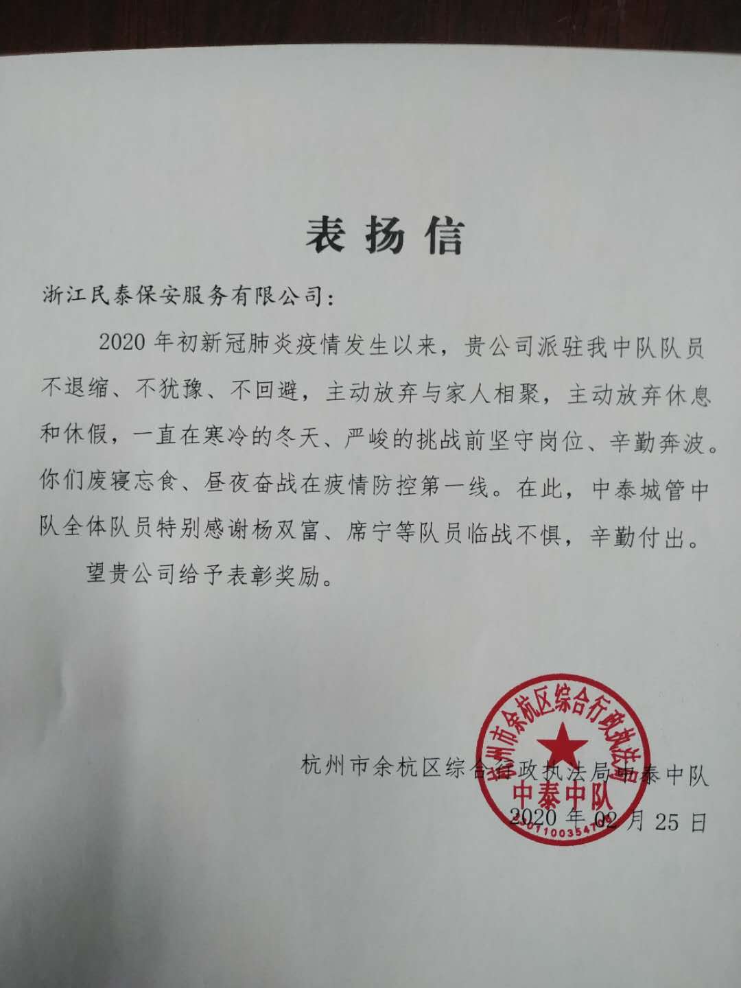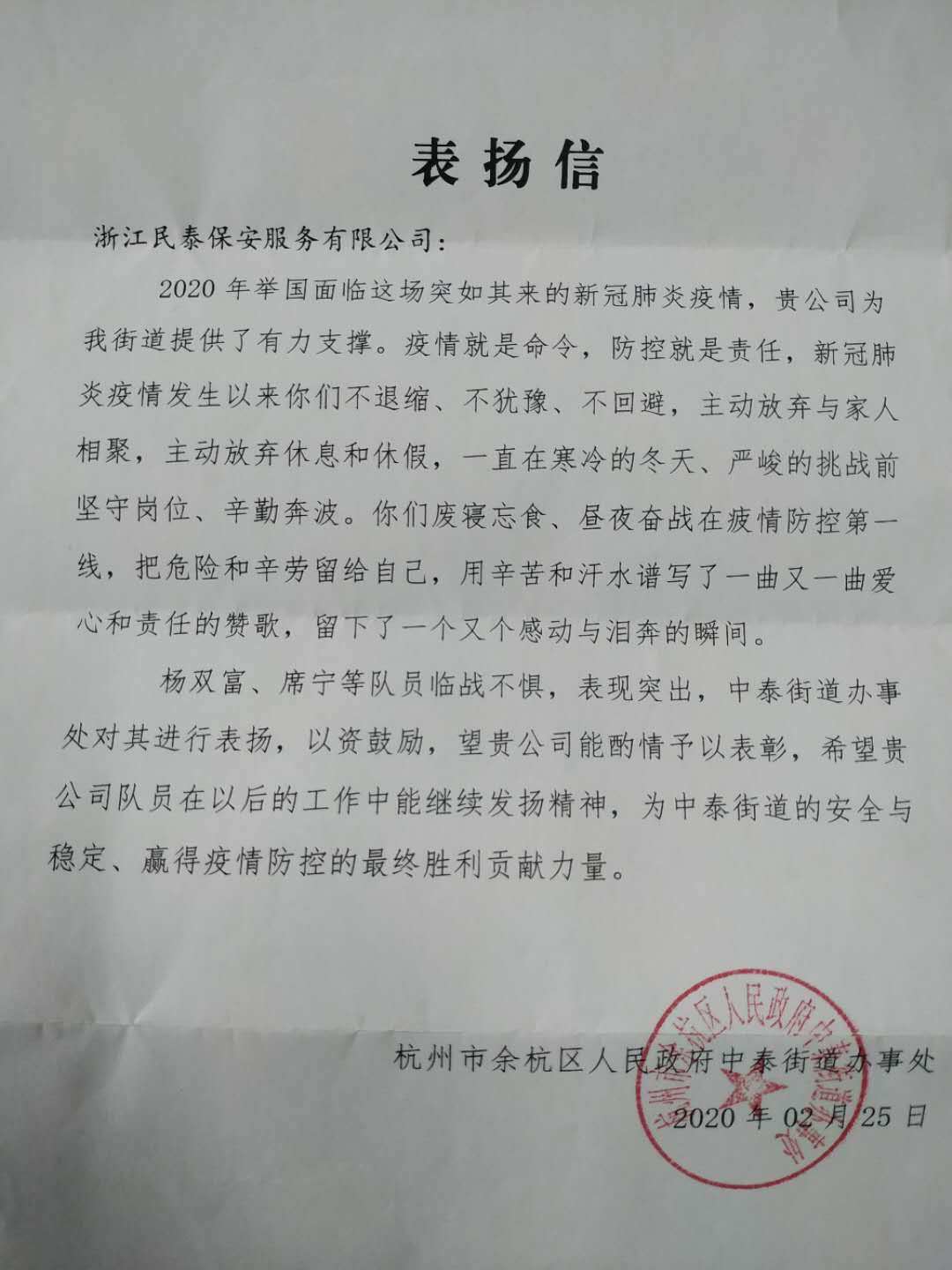 2月25日,杭州市余杭區(qū)中泰街道辦事處和該街道城管隊(duì)分別送來表揚(yáng)信,表揚(yáng)浙江民泰公司駐該街道城管項(xiàng)目全體隊(duì)員在疫情防控中的工作表現(xiàn),點(diǎn)名表揚(yáng)楊雙富、席寧兩名隊(duì)員。