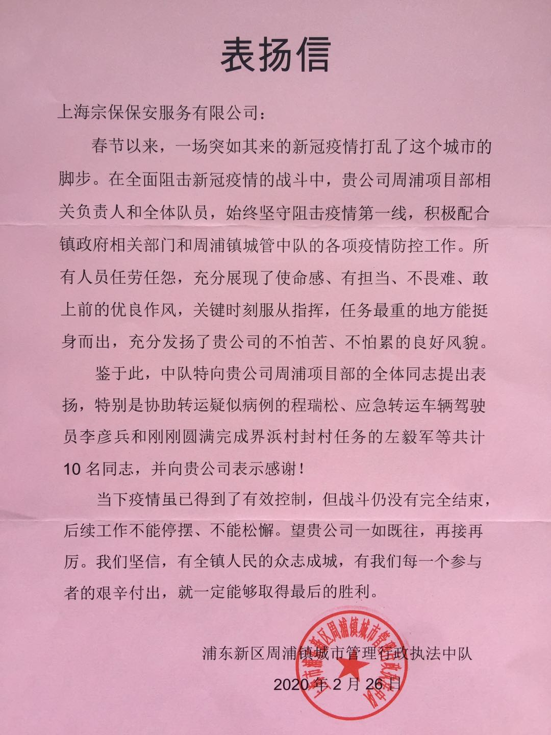 2月26日,浦東新區(qū)周浦鎮(zhèn)城管中隊(duì)送來表揚(yáng)信,表揚(yáng)公司駐周浦市容項(xiàng)目全體隊(duì)員在疫情防控中的工作表現(xiàn),特別對(duì)協(xié)助轉(zhuǎn)運(yùn)疑似病例的程瑞松、應(yīng)急轉(zhuǎn)運(yùn)車輛駕駛員李彥兵、圓滿完成界浜村封村任務(wù)的左毅軍等10名隊(duì)員重點(diǎn)表揚(yáng)。