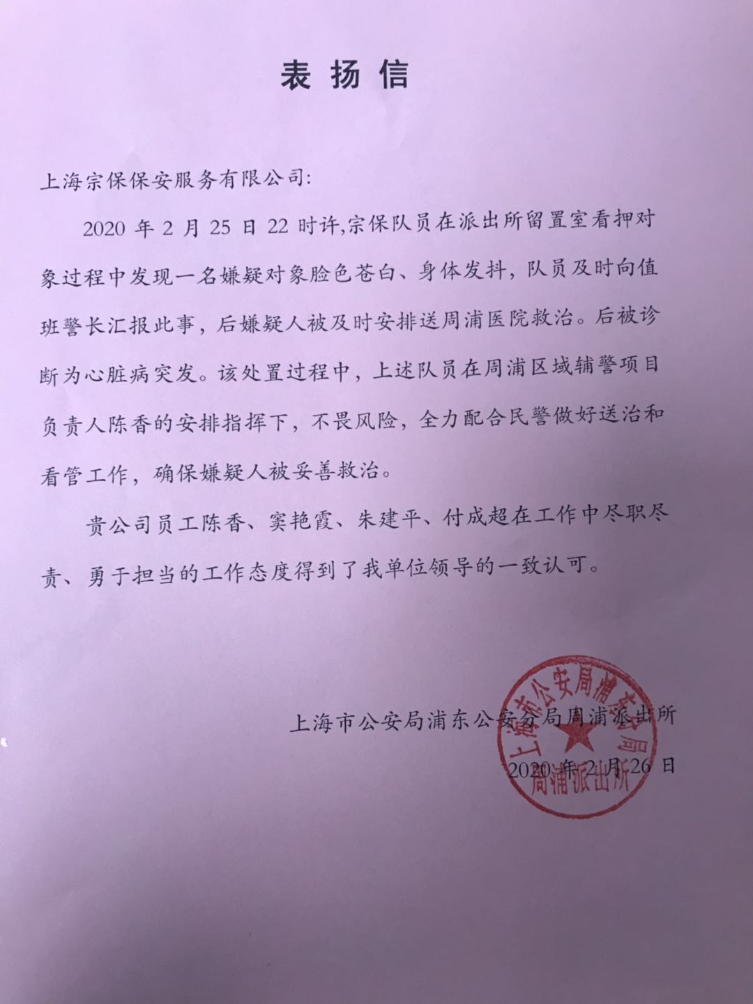 2月26日,浦東公安分局周浦派出所送來表揚(yáng)信,表揚(yáng)公司駐該所輔警項(xiàng)目陳香、竇艷霞、朱建平、付成超在工作中及時(shí)發(fā)現(xiàn)嫌疑對(duì)象發(fā)病,專業(yè)正確應(yīng)急處置的敬業(yè)精神。