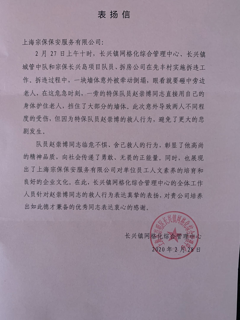 2月28日,宗保公司收到崇明區(qū)長(zhǎng)興鎮(zhèn)網(wǎng)格化管理中心送來的表揚(yáng)信,高度贊揚(yáng)公司駐長(zhǎng)興島城管項(xiàng)目隊(duì)員趙崇博在拆違過程中臨危不懼、舍己救人的行為。